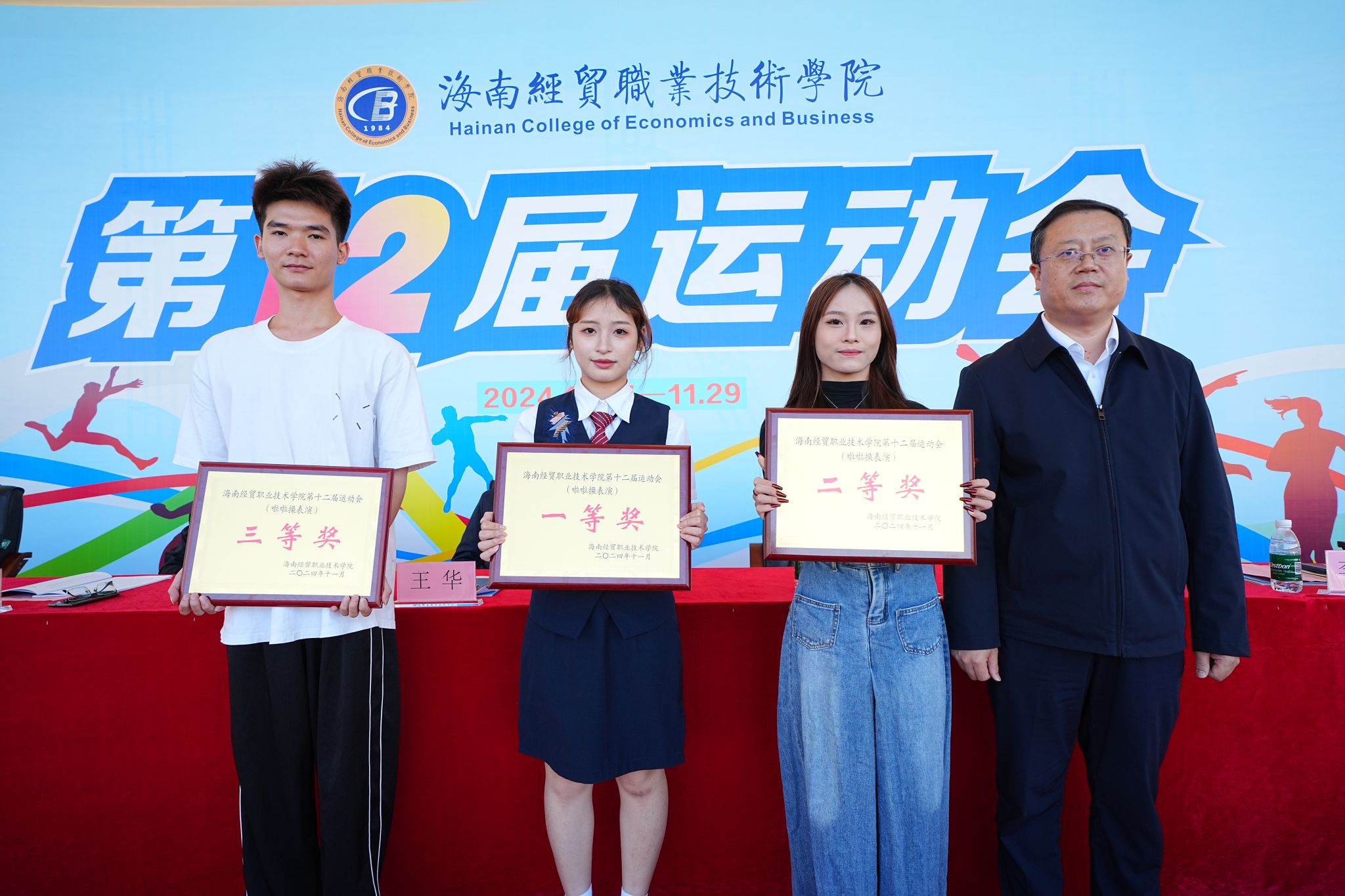 王华致闭幕词。他向取得优异成绩的运动健儿表示热烈祝贺,向所有热情参与运动会的广大师生以及付出辛勤劳动的工作人员、教练员和裁判员们表示衷心感谢。他说,运动员师生在过去三天的比赛中以锐意进取的蓬勃朝气充分演绎了海经贸人自强不息、勇于挑战、超越自我的卓越品质,共同呈现了一场奉献真心、增进情谊、收获感动的体育盛会。此时此刻,正在三亚举办的第十二届全国少数民族传统体育运动会赛况如火如荼,我们既要通过眼前这堂生动的“大思政课”凝聚思想共识、汲取奋进力量,又要传承好中华体育精神,进一步发挥体育在锻炼身心、展示风采、增进情谊方面的重要作用。