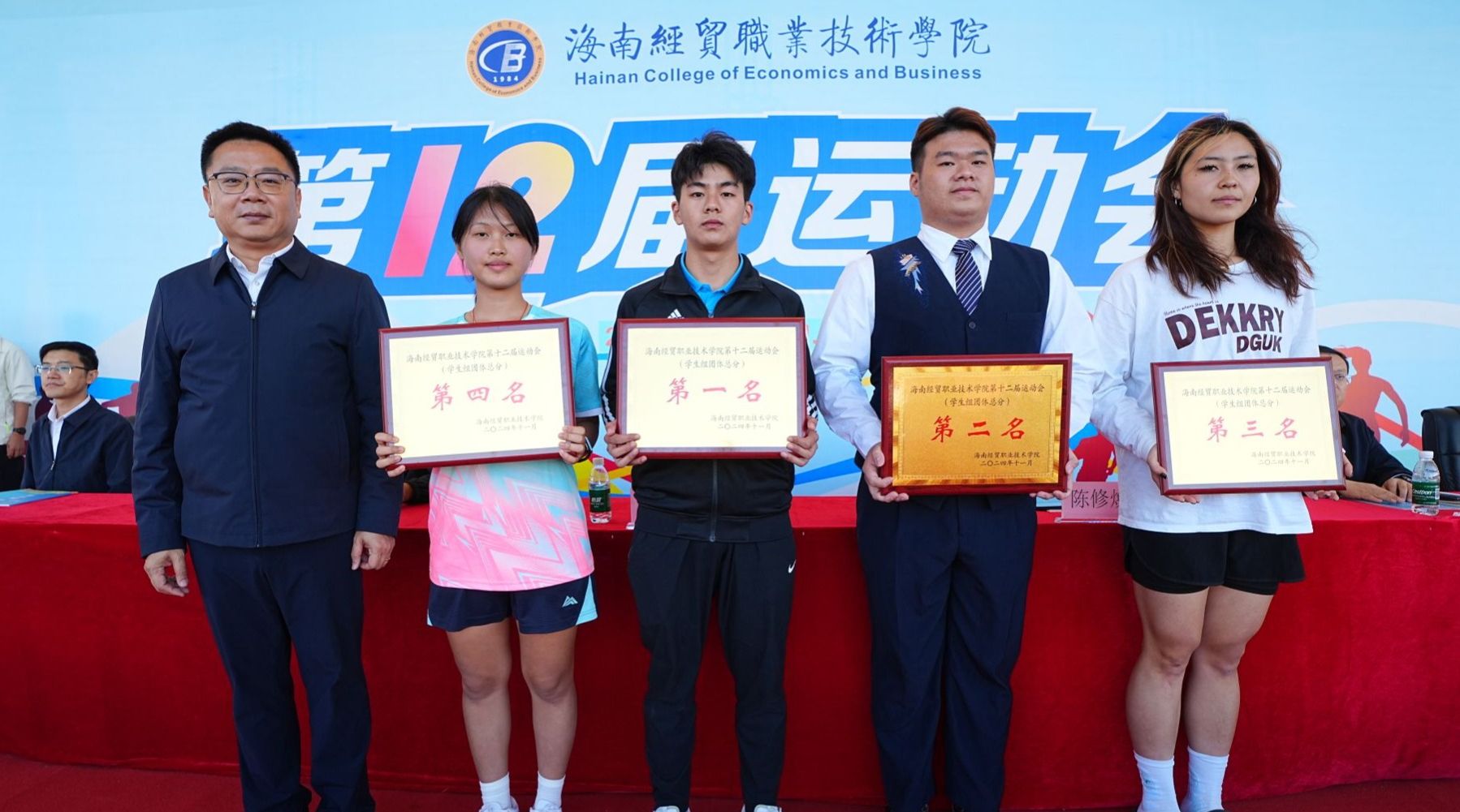 闭幕式上,学校表彰了本届运动会获奖团体和个人。国际贸易学院、机关第二分工会、机电与汽车工程学院、机关第一分工会、国际教育学院、信息技术学院分别获得教职工团体总分第一至第六名;体育与健康学院、国际旅游学院、信息技术学院、财务管理学院荣获学生团体总分第一至第四名;信息技术学院、国际旅游学院、人文艺术学院获得体育道德风尚奖;财务管理学院、信息技术学院、国际旅游学院获得入场式优秀奖;国际旅游学院、国际贸易学院、财务管理学院获得啦啦操表演奖一、二、三等奖;陈磊等28人获得“优秀裁判员”称号;陈明艳等18人获得“优秀运动员”称号。