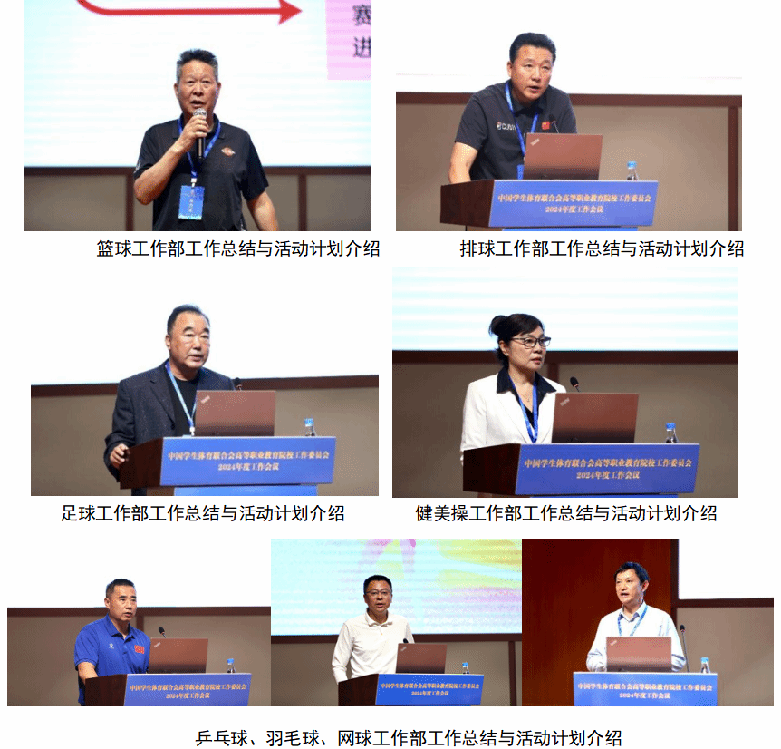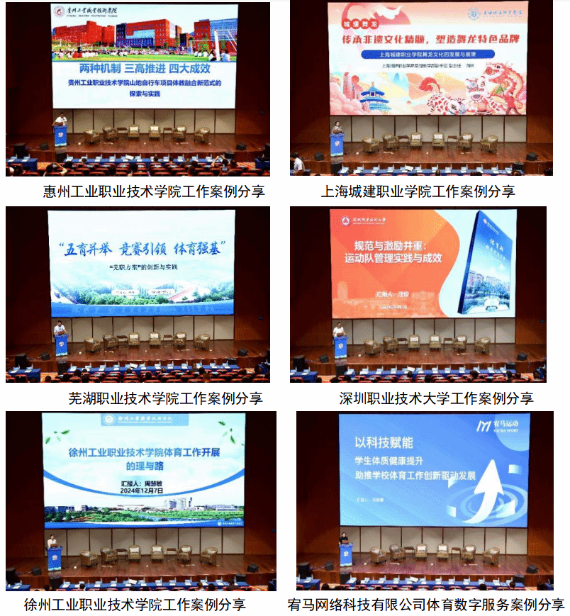 会议还进行了部分高职院校体育工作案例分享和《以科技赋能学生体质健康提升,助推学校体育工作创新驱动发展》的项目分享。中国学校体育联合会高职分会篮球、排球、足球、健美操、乒乓球、羽毛球和网球项目工作部作为项目工作部代表分别作了2024年总结与2025年工作计划进行汇报。会议还举行了全国高等职业教育院校飞盘运动联盟成立仪式,组织了以“快乐、健康、担当”为主题的2024年年度会议阳光跑活动。