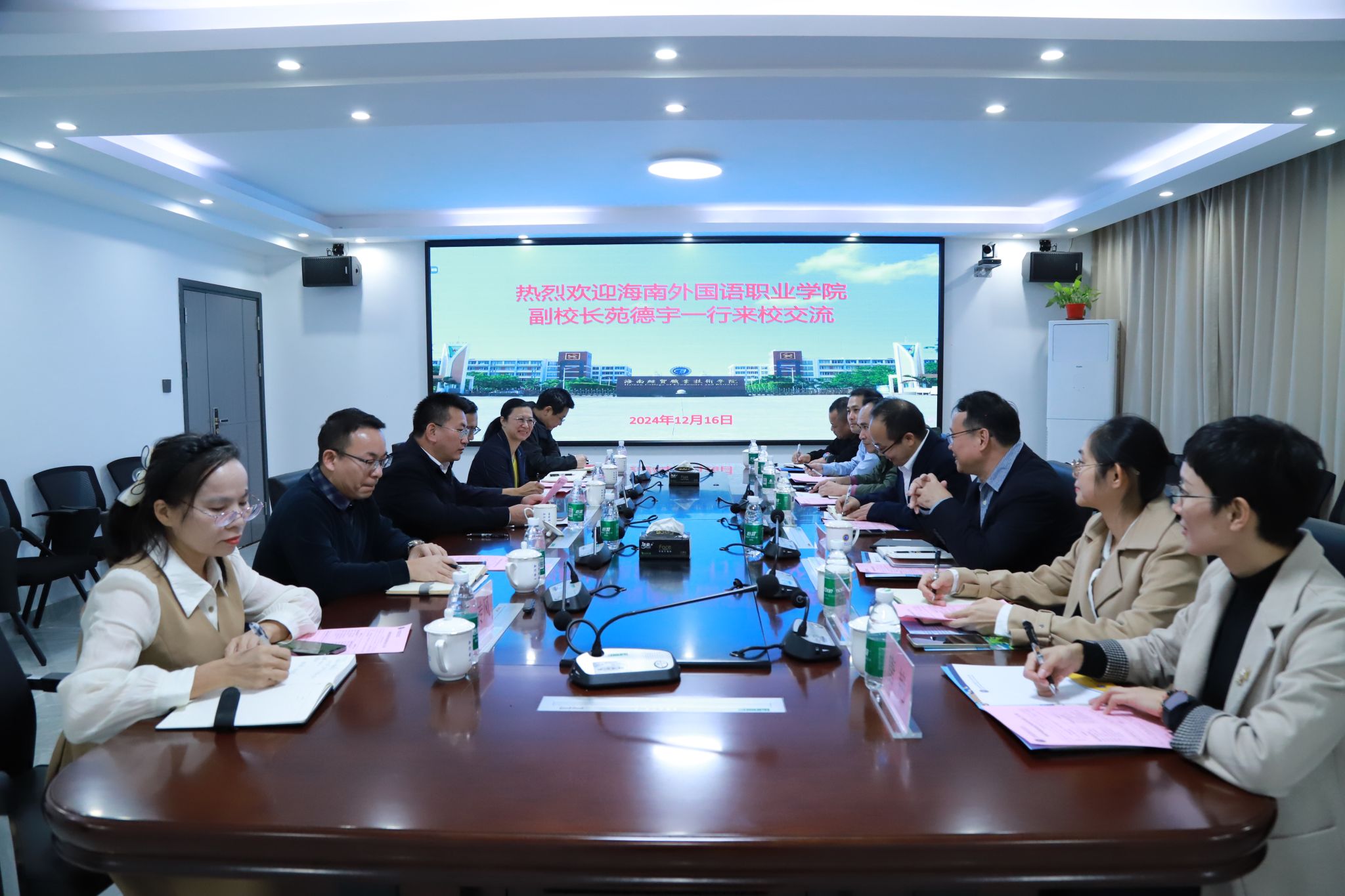 崔昌华对海南外国语职业学院一行的到来表示热烈欢迎,并介绍了学校近年来在招生与就业创业等方面取得的成绩和未来规划。他说,海经贸与海外院同为海南高职院校,兄弟院校情谊深厚,希望两校进一步深入沟通与交流,搭建起资源共享、互学互鉴、共同发展的合作平台,共同推动海南职业教育高质量发展。