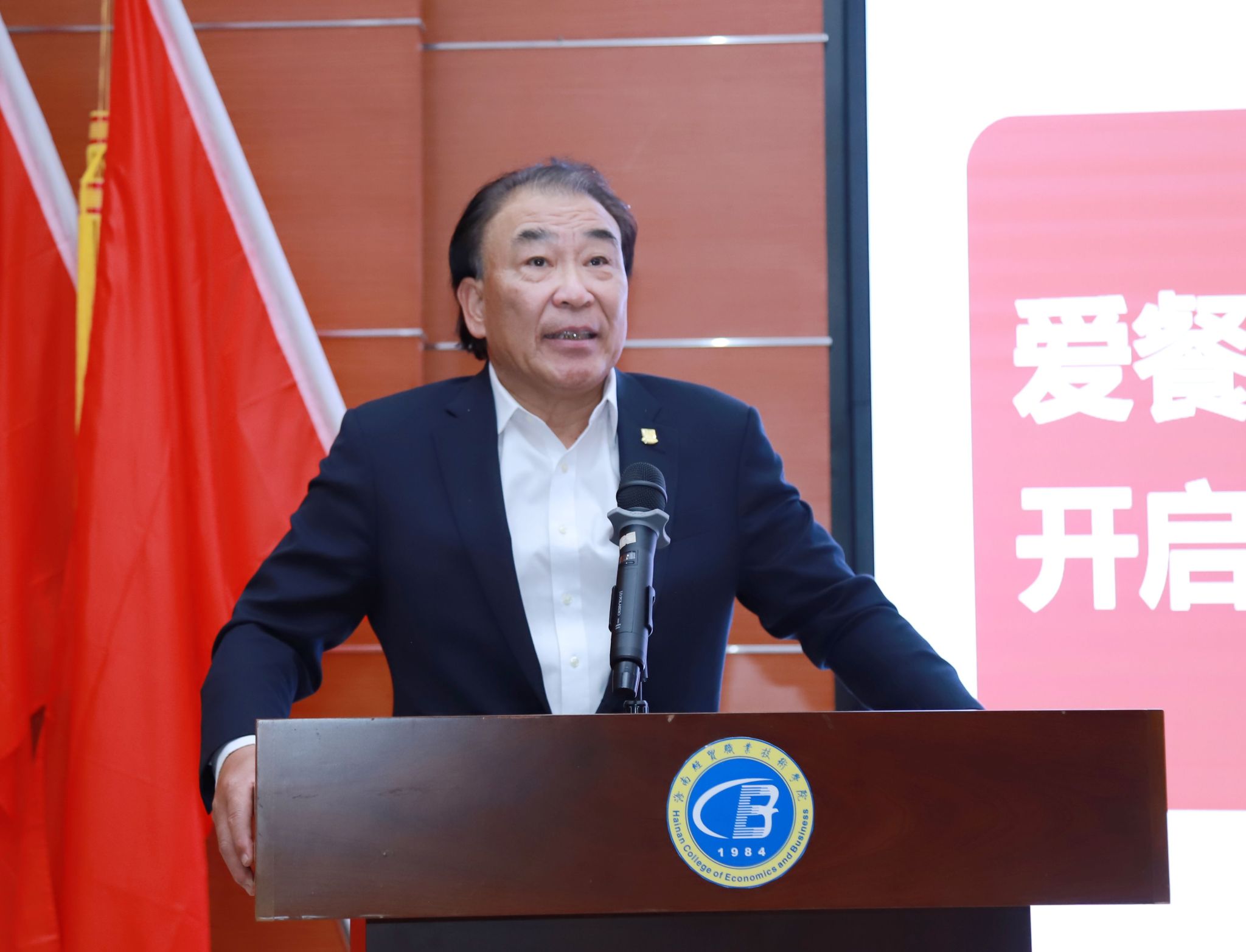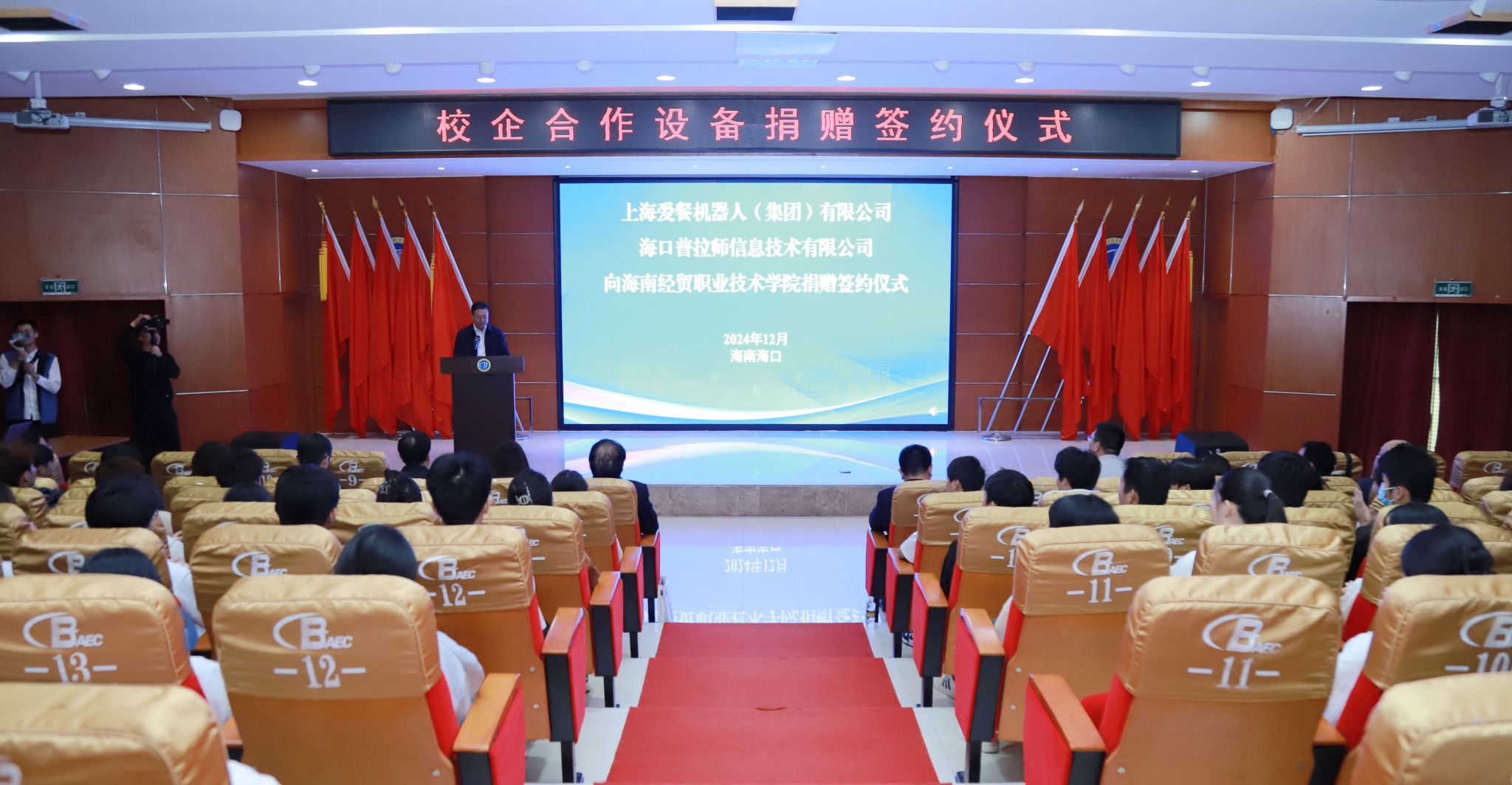 活动现场举行了捐赠签约和捐赠设备交接仪式。上海爱餐公司向海经贸捐赠 10 台厨神教练机,专用于学校智慧烹饪实训室教学。海口普拉师公司作为上海爱餐公司的本地服务商,将协助完成设备的安装调试,为学校提供后续技术支持。学校接受捐赠,并设立爱餐智慧烹饪实训室。