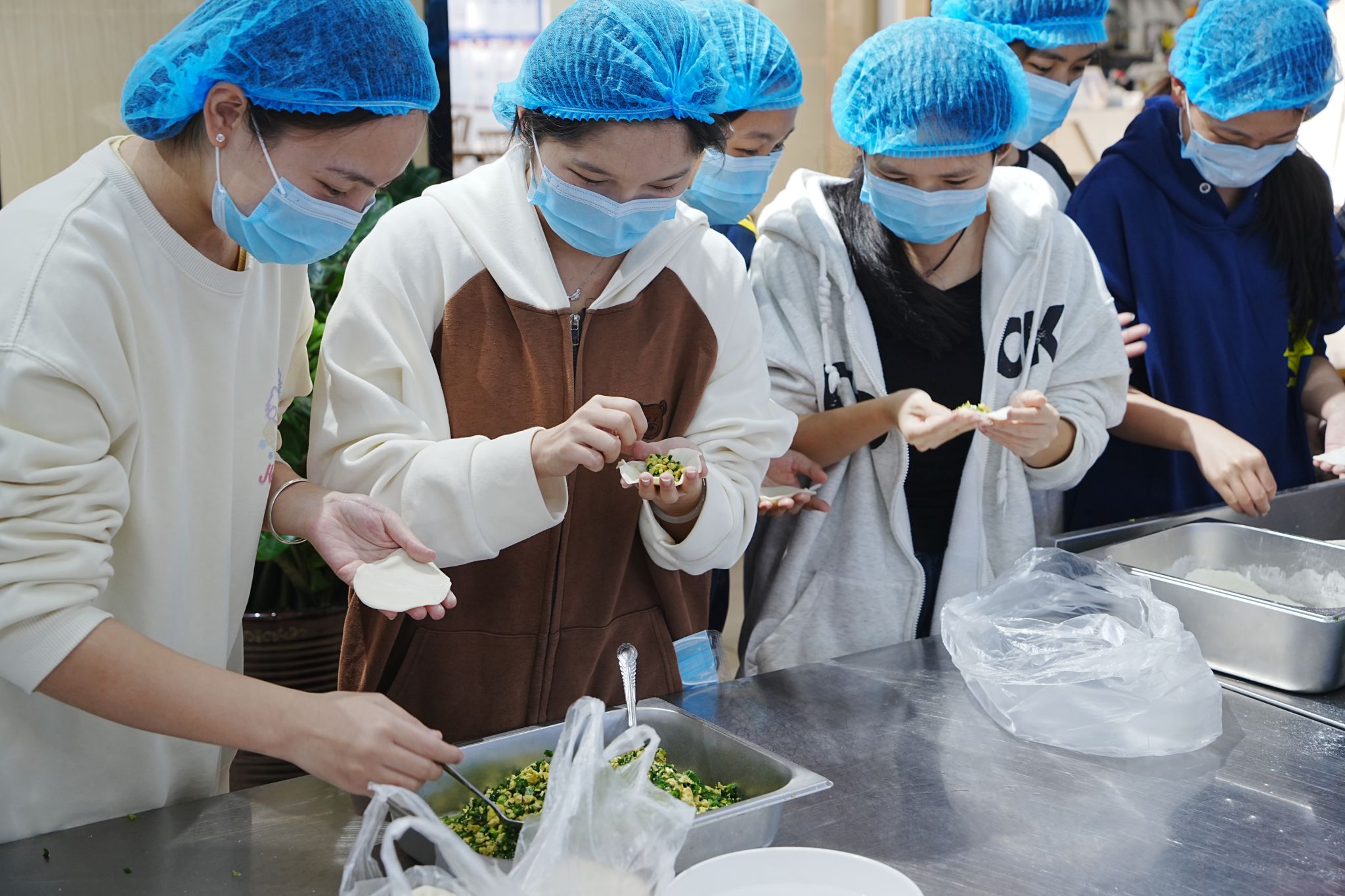 活动现场,师生代表们在食堂工作人员的精心指导下,摩拳擦掌准备大展拳脚。面皮的香气和馅料的鲜香交织在一起,师生们默契配合,边包边聊,现场充满了欢声笑语。饺子的形状千奇百怪,各具特色的饺子同时出现在一个面板上,就好比来自五湖四海的同学们,在海经贸相遇。