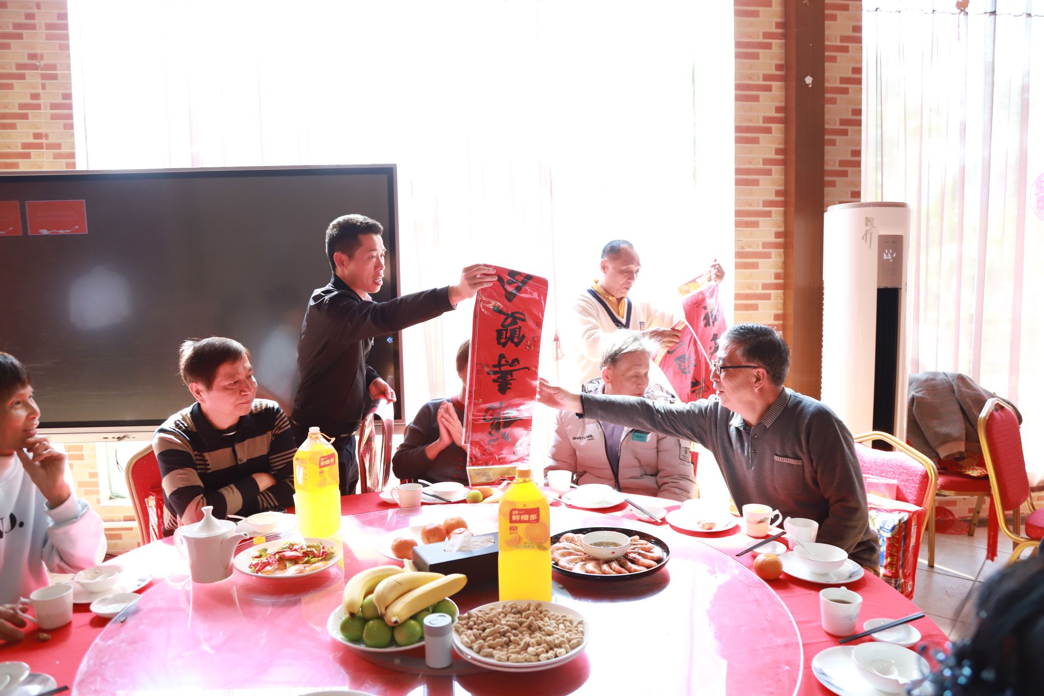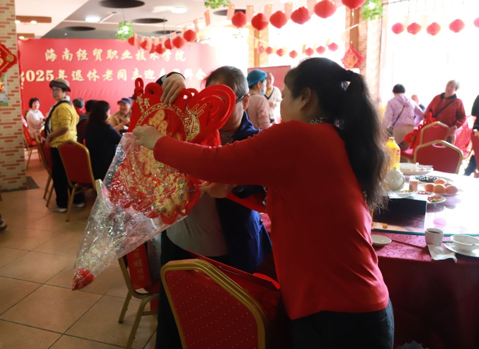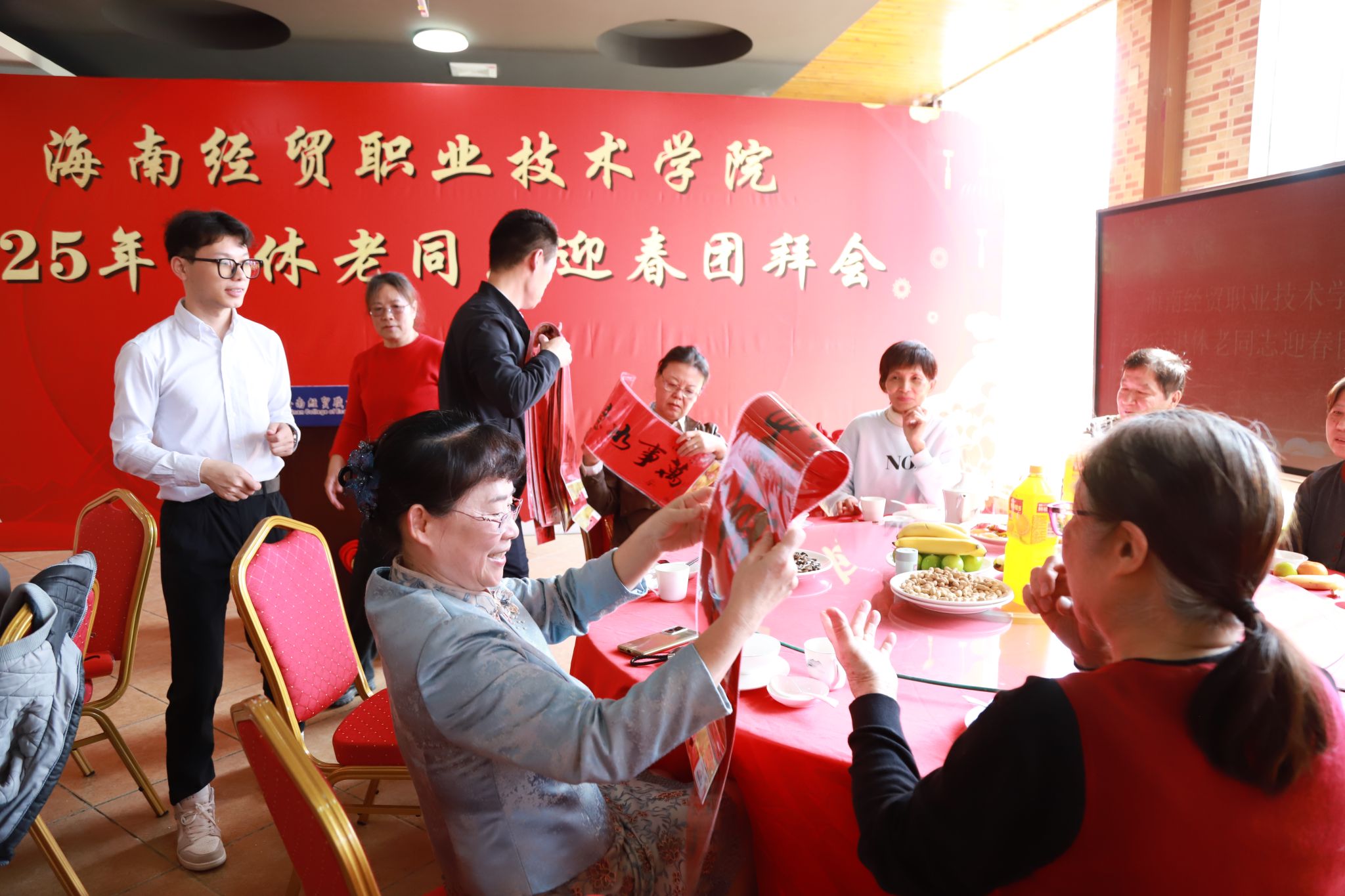 品美食、写“福”字、送对联……团拜会现场气氛热烈,充满了欢声笑语。老同志们集体观看了学校宣传片,深刻感悟学校在办学条件、人才培养、师资队伍、国际化办学等方面的成就。工作人员把退休老教师林长武教授现场写的“福”字送到每一位退休教师手中,学校还为大家准备了丰富的春节慰问品和美味的菜肴,感谢退休老教师们为学校发展所作出的贡献。