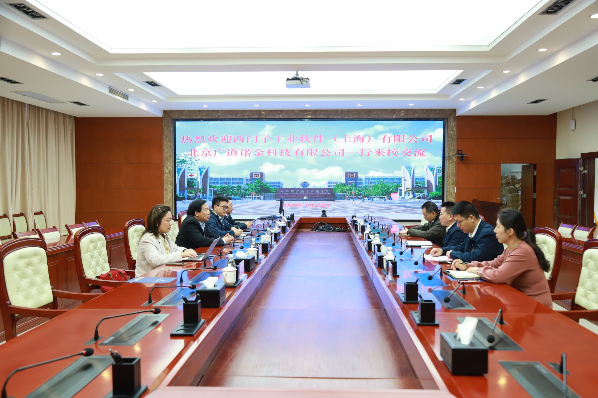 2025年1月22日,西门子工业软件(上海)有限公司副总裁张雁、北京广道诺金科技有限公司副董事长吴继伟一行4人来到kaiyun登录中国入口登录,就深化产教融合、校企合作,推动工业数字化转型升级等方面工作进行交流座谈。学校党委副书记、校长崔昌华热情接待了张雁一行。