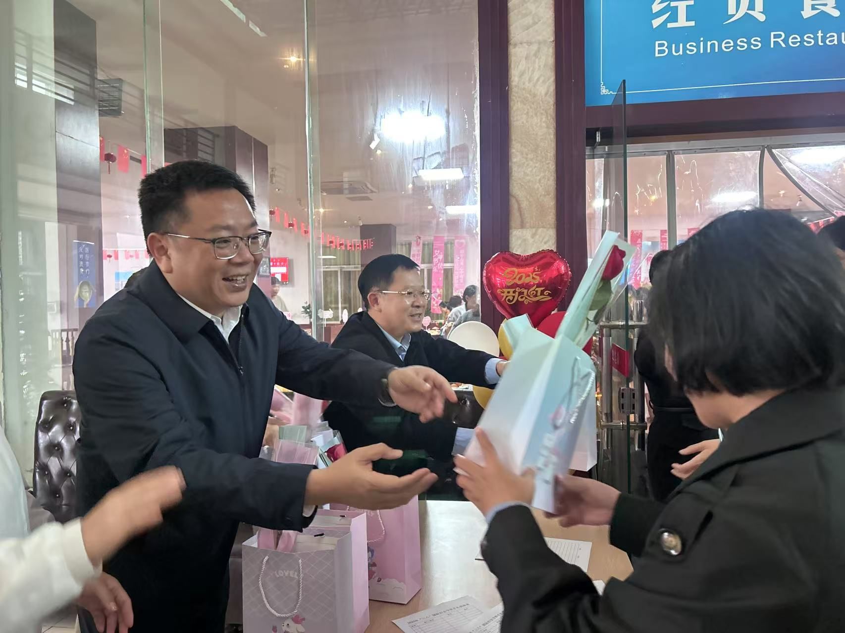 红色气球氛围温馨、可口美食琳琅满目……教职工食堂准备了特色菜品、水果拼盘、美味茶点,每一样都承载着学校对全体女同胞的深情祝福。“祝全体女同胞节日快乐!希望大家工作顺利、家庭美满、幸福安康!”学校党委书记王华,党委委员、副校长陈修焕和广大女教职工欢聚一堂,为大家切蛋糕、送鲜花和礼品。大家的脸上洋溢着的灿烂笑容,为节日增添了一份特别的温暖与甜蜜。