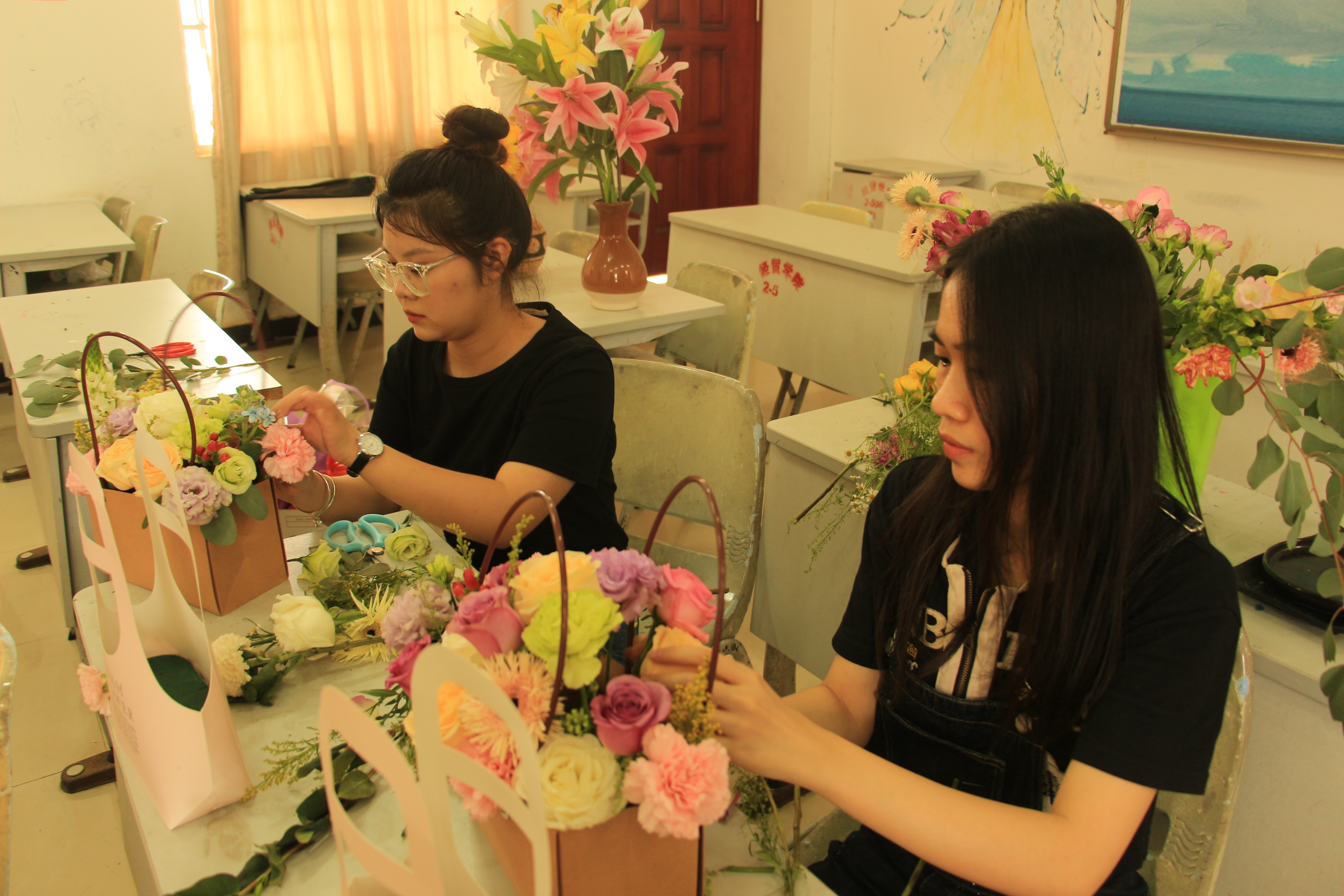 海经贸学生展示插花技能。