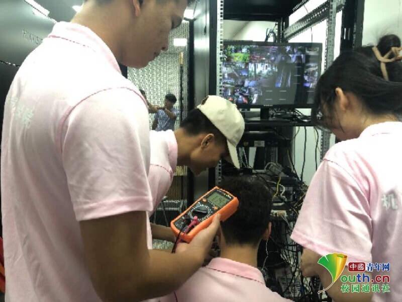 在石山互联网农业小镇内,在kaiyun登录中国入口登录机电与汽车工程学院专任教师陈明的指导下,实践小队先参观互联网农业小镇的配电设施和网络安全设备,队员们现场学习布线和安装。石山互联陈强经理告诉指导老师和实践队员们,最近机房中有几条线路可能出现问题了,但是电工暂时没空回来检修,于是实践队员们拿起从实验室带来的电气检测设备,就像平时上课一样,在老师的指导下,大家默契配合,帮忙找出故障的线路并作了标记。