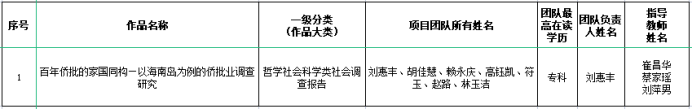 根据《关于开展第十八届“挑战杯”全国大学生课外学术科技作品竞赛作品申报工作的函》要求,经团省委决定,拟推选我校哲学社会科学类社会调查报告:《百年侨批的家国同构—以海南岛为例的侨批业调查研究》参加第十八届“挑战杯”全国大学生课外学术科技作品竞赛全国比赛,现将拟推荐作品向全校进行公示。