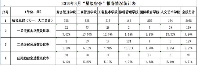 4月份,全院共有2038间宿舍参与“星级宿舍”评选,符合升星标准,晋升为“一星级宿舍”的有159间,晋升为“二星级宿舍”的有189间,其中,96间优秀星级宿舍获得奖励。具体情况如下: