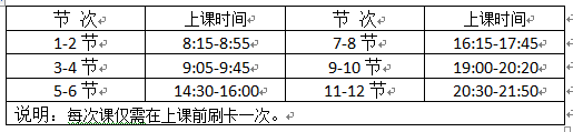 1.电子考勤系统中考勤信息分为4种状态:“正常”、“迟到”、“请假”、“旷课”(课前10分钟内为正常刷卡时间,迟到10分钟内刷卡记“迟到”,未在有效时间内刷卡记“旷课”)。学生上课须持校园卡在电子考勤机上刷卡考勤。电子考勤以课表上每次连续的上课时段为单元,具体上课时段为: