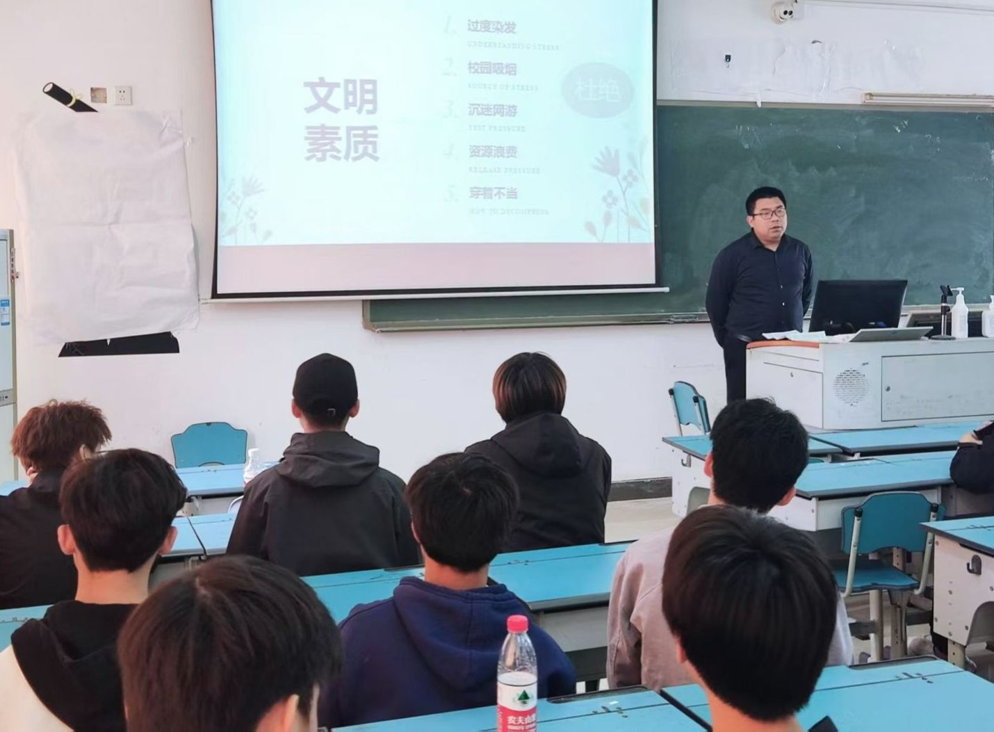 在班会上,老师们围绕学生文明素质养成,通过“教、学、管”三方面,分阶段、分层次、分重点,向过度染发、校园吸烟、沉迷网游、行为不雅、资源浪费、穿着不当等不文明行为说“不”,引导学生从自身出发,注重个人形象,摒弃生活陋习,遵守校规校纪,学习文明礼仪,营造良好学风、院风,助力构建文明和谐校园。