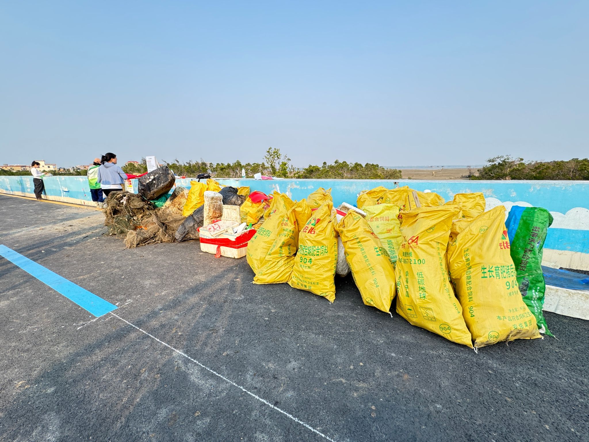 志愿者们以小组对抗比赛的形式进行净滩活动。他们不畏烈日,携带垃圾袋、钳子等工具,沿着退潮后的红树林滩涂,细致搜寻并清理各类垃圾,将塑料瓶、包装袋、泡沫箱、废弃渔网等垃圾一一拾起,以实际行动为滨海渔村增添生态魅力。