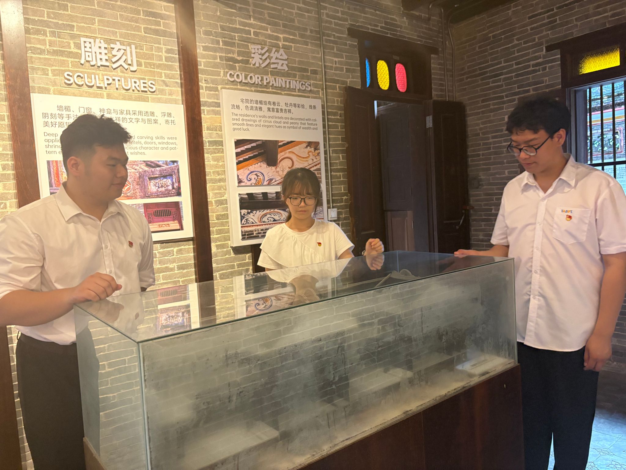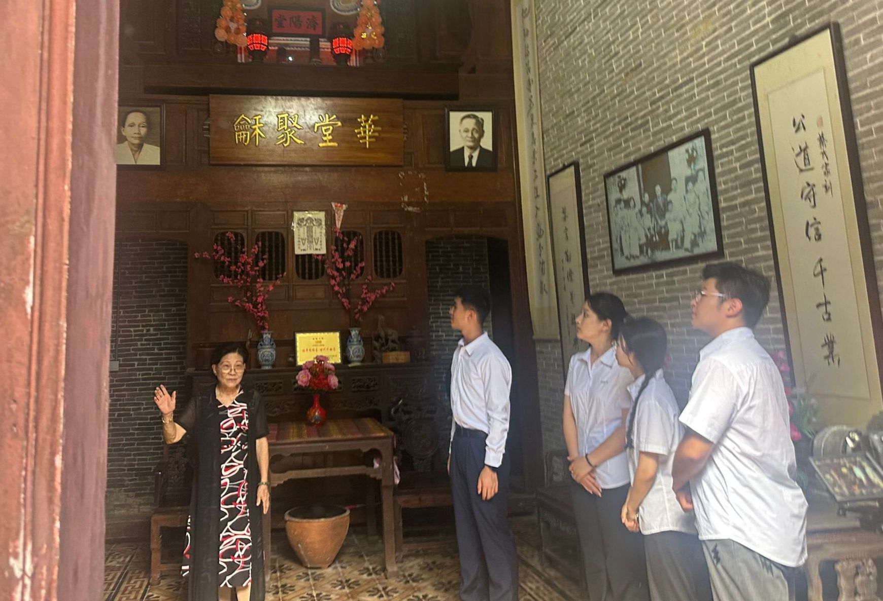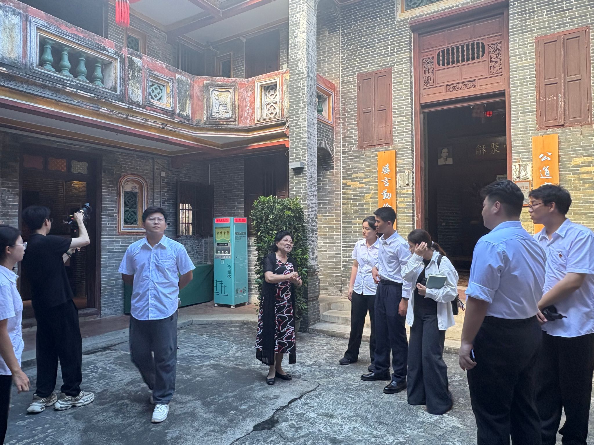 师生们在蔡家宅第四代主人蔡王普君带领下,沿着中轴线参观“四厅六房”布局,重点学习蔡家宅“公阁”祭祖文化、家训楹联及防卫智慧。宅内悬挂的“公道守信千古业,婆言勤俭万年兴”祖训,生动诠释了蔡氏家族“诚信立身、勤俭持家”的治家理念,其背后折射出的华侨群体“落叶归根、反哺故土”的情怀,令在场师生动容。