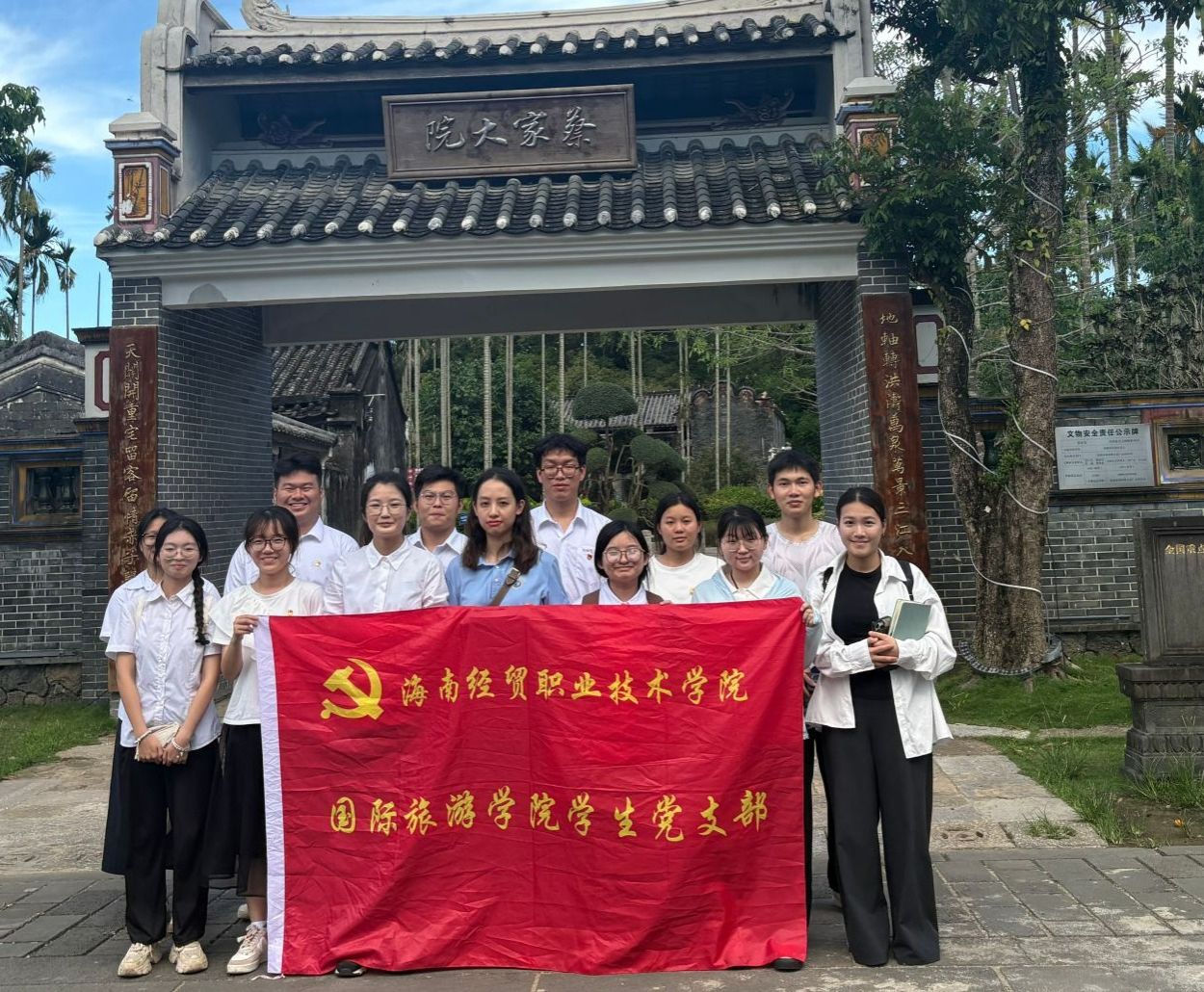 2025年5月16日,国际旅游学院学生党支部组织师生党员、入党积极分子及团学骨干前往琼海市博鳌镇留客村,开展“百年蔡家宅 心系家国情”主题党日活动。通过实地探访“海南侨乡第一宅”蔡家宅,结合专业特色开展沉浸式党史学习教育,引导师生感悟华侨奋斗历程,汲取新时代奋进力量。