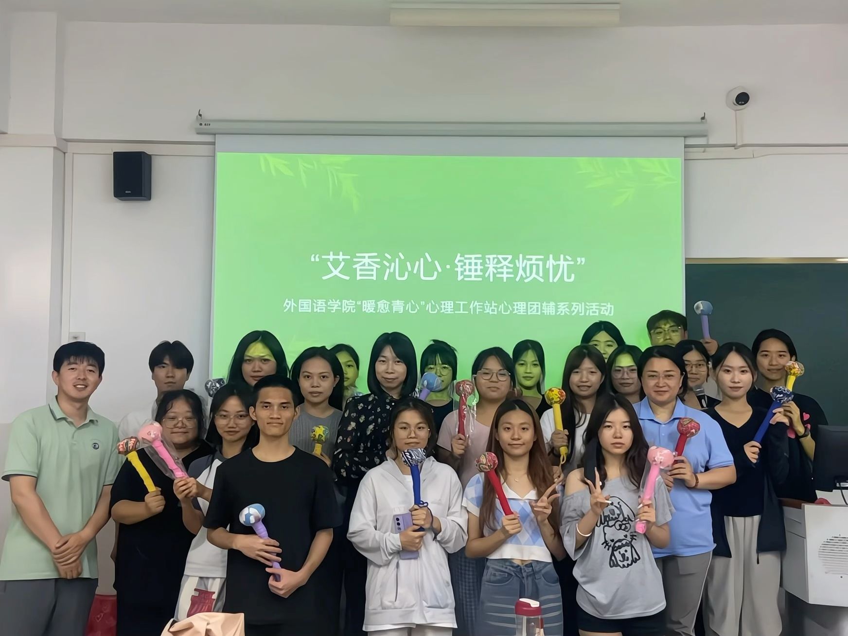端午将至,艾香四溢。为关爱学生心理健康,引导学生释放压力、舒缓情绪,2025年5月27日,外国语学院“暖愈青心”心理工作站开展“艾香沁心·锤释烦忧”心理团体辅导活动。