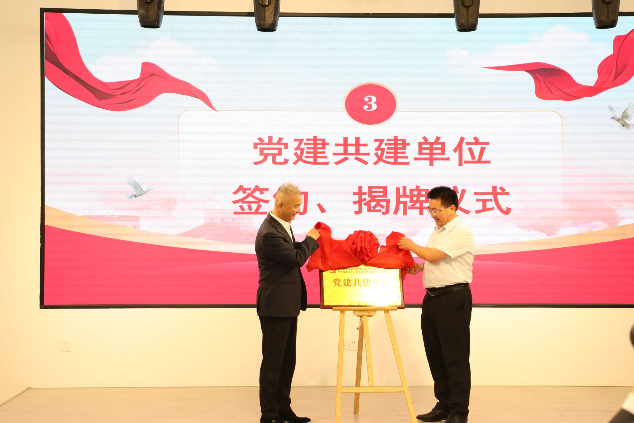 为深化党建联建,厚植爱党爱国情怀,传承红色精神血脉,2025年6月10日,国际旅游学院教工党支部与海口美兰机场酒店党支部举行党建共建签约仪式,并开展“诵红色经典,传初心使命”红色诗歌朗诵比赛。kaiyun登录中国入口登录党委副书记、校长崔昌华,兰机场酒店何锡洪总经理共同为党建共建牌匾揭牌。