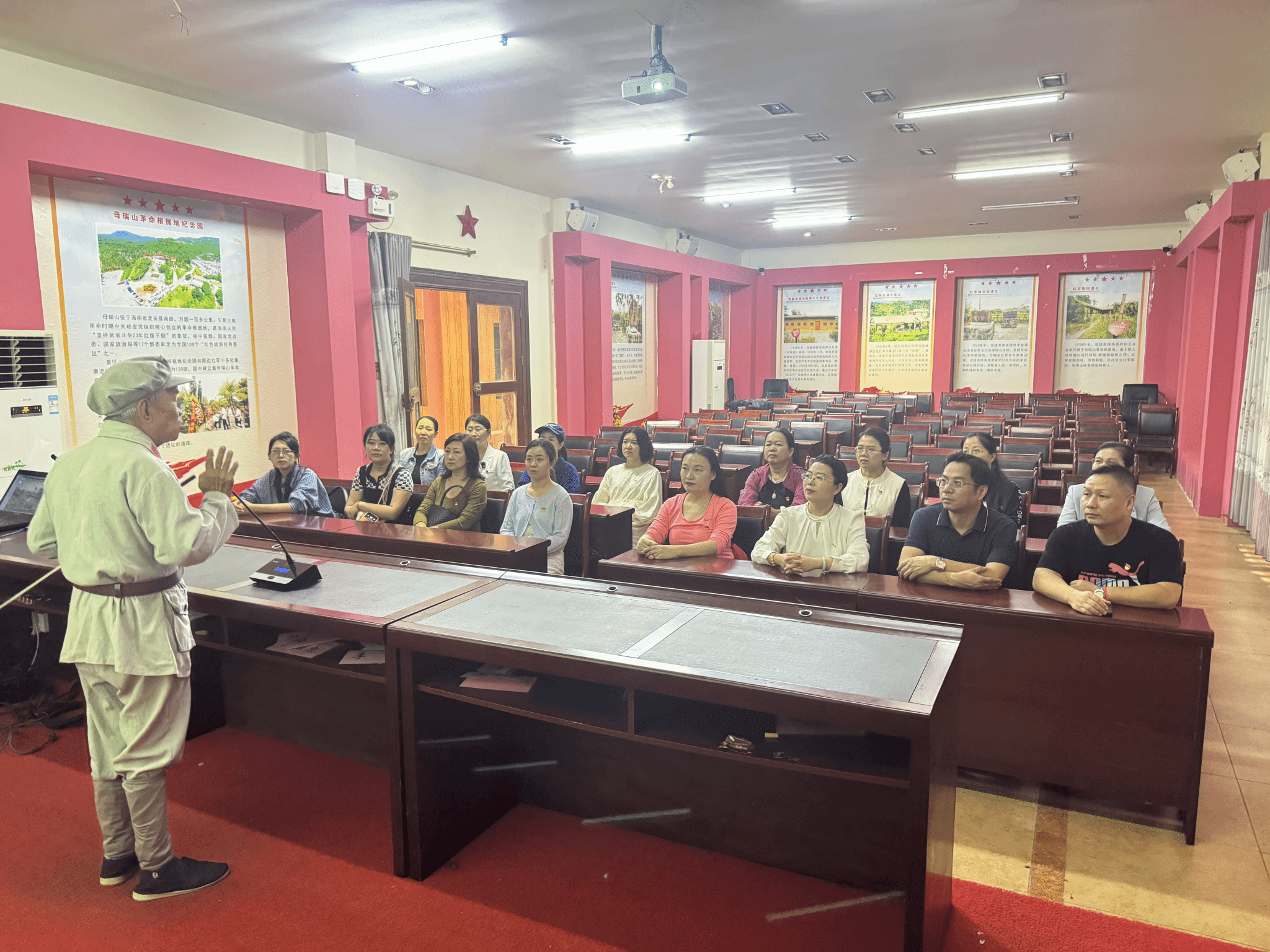 党员们步入琼崖革命斗争历史馆,一幅幅珍贵的史料图片、一件件承载记忆的革命文物,细致展现了琼崖红军在母瑞山两次保存革命火种的壮阔历程。80余岁的纪念园老馆长王学广以“山不藏人人藏人”的深情讲述开篇,将革命斗争中红军战士以“革命菜”充饥、用芭蕉叶御寒、勇士成功突围的故事娓娓道来。在场党员深刻体会到琼崖革命“二十三年红旗不倒”的精神密码。