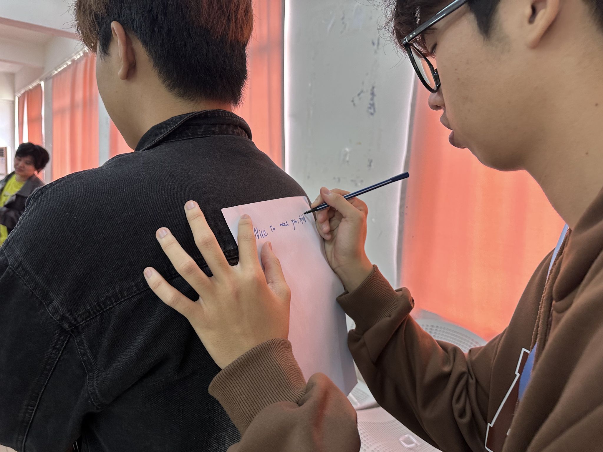 活动伊始,指导老师以一段富有画面感的“人生风暴”故事,带领同学们从“高中小船”驶入“海经贸港湾”,迅速点燃了同学们的热情与期待。活动精心设置“岛屿风暴”“篝火相聚”“海岛物语”“同心寻宝”四个环节,循序渐进达成“破冰—熟识—协作—凝聚”的心理融入目标。“岛屿风暴” 环节以趣味换位游戏为载体,快速消融同学间的陌生感,打破初见的隔阂;“篝火相聚” 通过姓名与家乡接龙的温馨互动,让同学们在分享中深化了解、拉近距离,构筑起情谊纽带;“海岛物语” 以报纸建塔的创意挑战,充分激发大家的想象力与协作意识,在动手实践中悄然增进团队默契; “同心寻宝” 环节,借助后背匿名祝福的暖心形式,让真挚的期许与善意双向传递,将同窗情谊推向高潮。整场活动在欢声笑语与温情感动中圆满落幕,切实助力同学们筑牢集体认同感、凝聚班级向心力,也为未来的同窗时光奠定了深厚的情感基础。