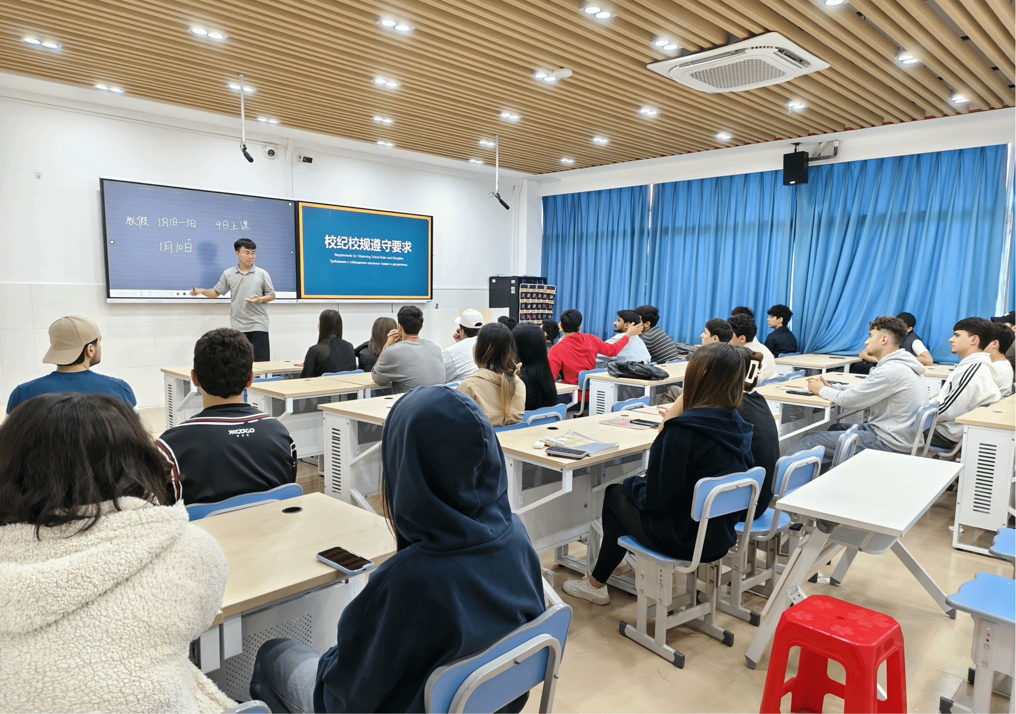近日,国际教育学院召开期末考风考纪教育暨假期安全教育专题会。全体国际学生参加会议。