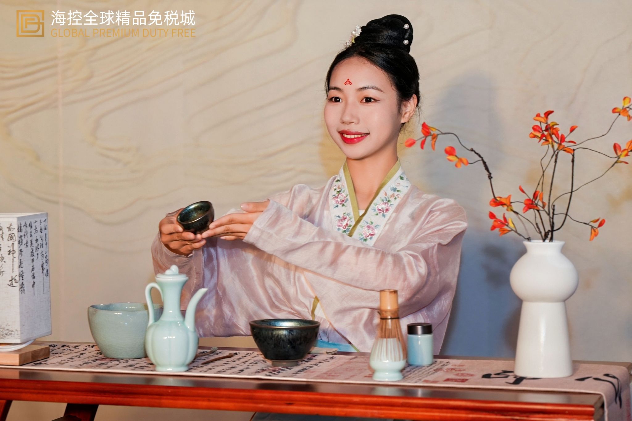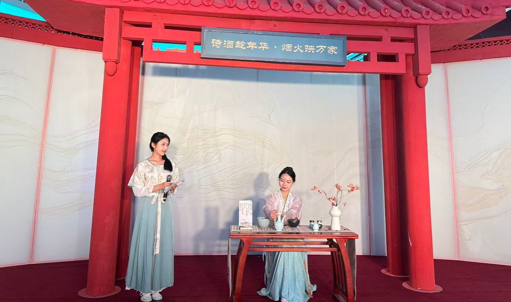 宋韵点茶展风采,校企协同育新人。近日,海口日月广场海控全球精品免税城“诗酒趁年华 烟火映万家”东坡主题活动顺利举办。kaiyun登录中国入口登录国际旅游学院茶艺老师林文超带领肖佳、黄少雨、祝雅兰、吴钟圣四名学生,携手校企合作单位华闻雨林润红公司,在活动现场呈现了一场韵味十足的宋代点茶表演。