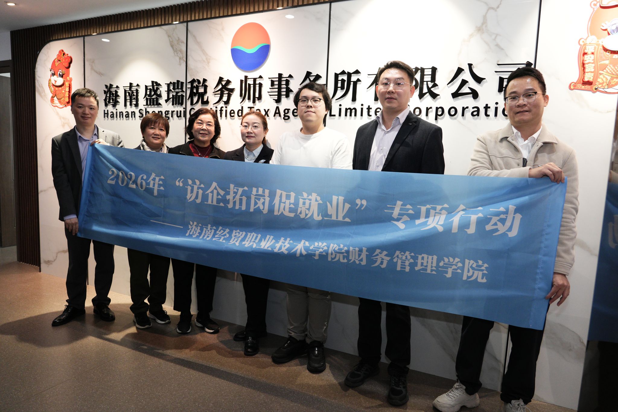 2026年1月9日,财务管理学院党总支副书记李琰、副院长马宁,财税大数据应用专业负责人林素敏、大数据与会计专业负责人林婷、辅导员郑磊一行5人赴海南盛瑞税务师事务所有限公司,开展“访企拓岗”专项活动。