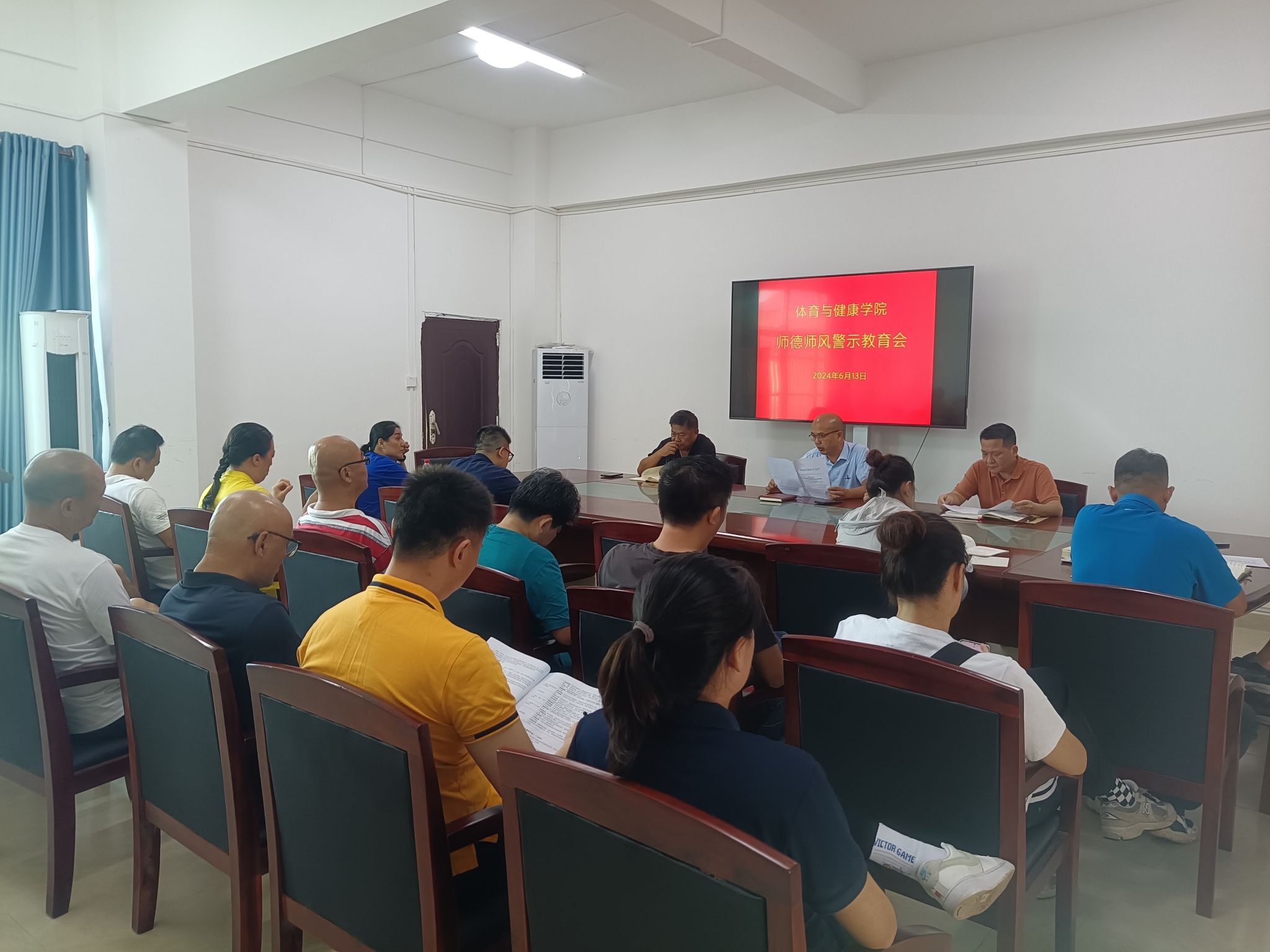 2024年6月13日,体育与健康学院召开专题会,学习习近平总书记关于师德师风建设的重要论述,结合省教育厅通报的8起违反师德师风典型案例开展警示教育。