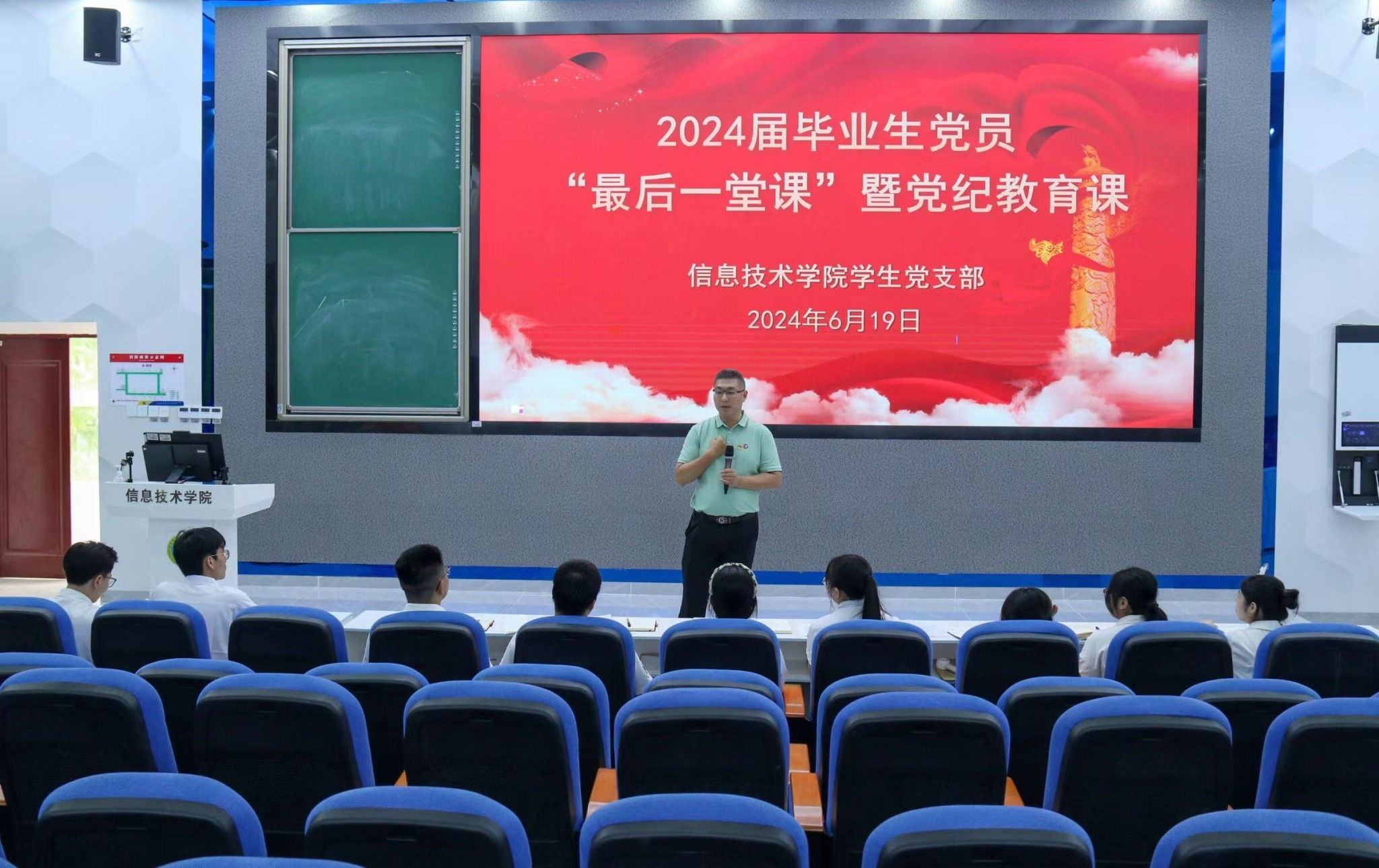 6月19日,信息技术学院学生党支部开展2024届毕业生党员“最后一堂党课”,为即将告别校园,迈向社会的学生党员上了一堂生动的党纪学习教育课,提高纪律意识,为他们即将开始的新征程打下坚实的思想基础。