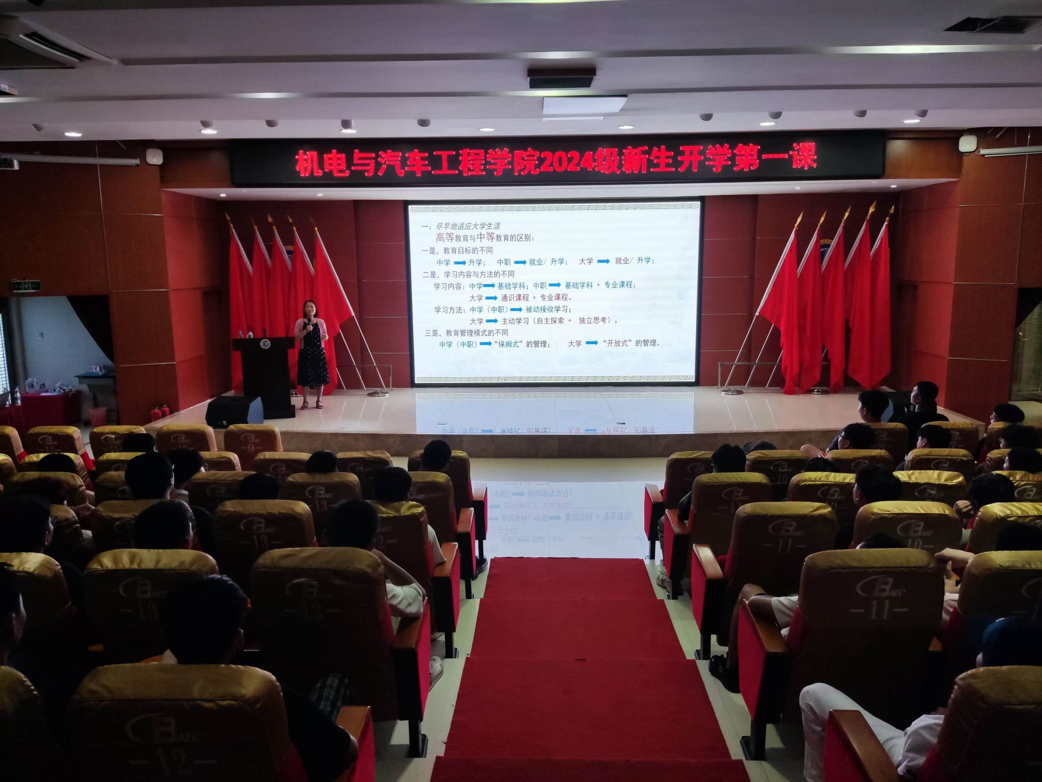 2024年9月13日,机电与汽车工程学院开展“早识大学 不留遗憾”新生系列入学教育第一课,帮助2024级新生尽早适应大学生活,更好地融入大学校园。机电与汽车工程学院党总支书记黄邦姬主讲。
