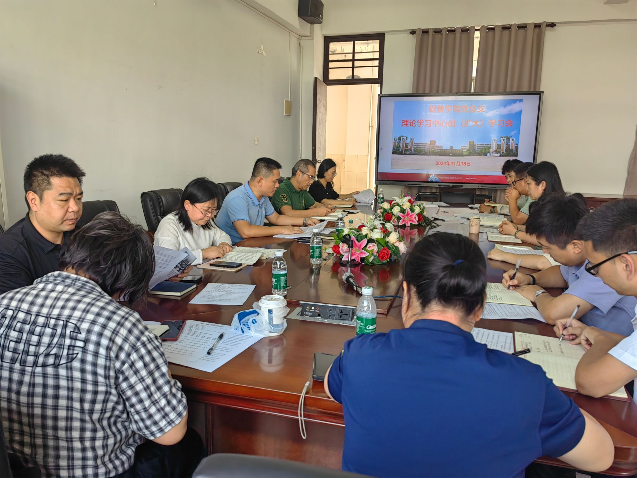2024年11月18日,财务管理学院党总支召开理论学习中心组(扩大)会议,集中学习习近平总书记《论教育》相关内容和全国教育大会精神、全省教育大会精神。学院党总支书记范高智主持会议。党总支理论学习中心组成员、学院副院长和党政办公室主任及副科级以上干部参加会议。学校宣传统战部副部长王晓灵、张凡老师到会列席旁听。