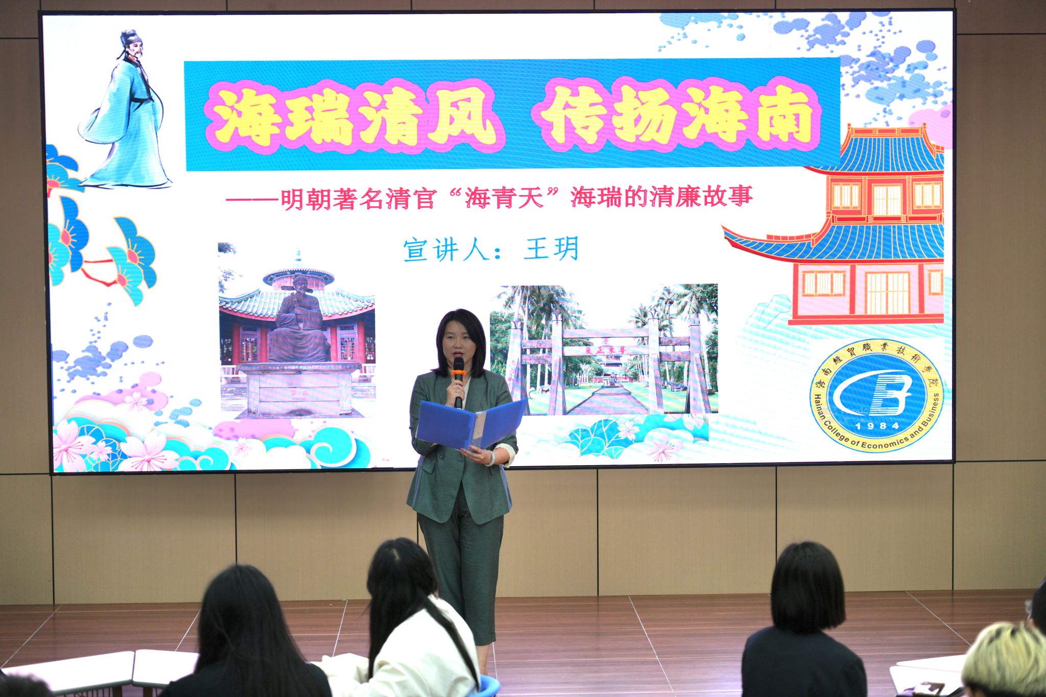 活动在海瑞的故事中拉开帷幕。视频中展示了海瑞故居的古朴风貌,通过生动的画面和解说,展现出海瑞跌宕起伏、充满传奇色彩的一生。文艺志愿者、国家二级播音员王玥老师作为本次分享会的主讲人,她生动形象地讲述了海瑞初入官场时的“长揖不跪”的故事,将他始终坚守节俭自律,在官场上面对权贵公正严明、无畏强权的生平娓娓道来。现场师生仿佛身临其境,被海瑞清廉自守的高尚品格和坚守正道的精神深深打动。