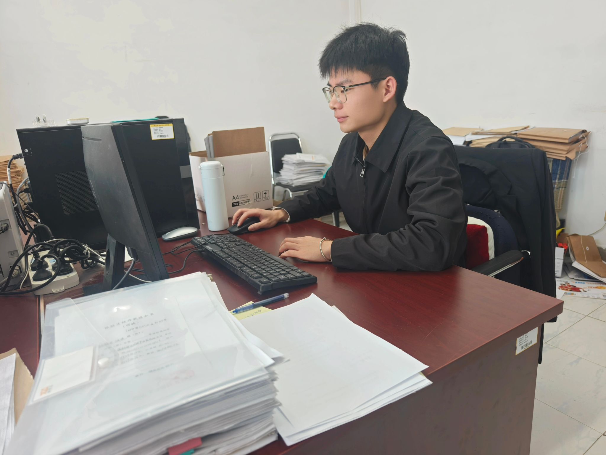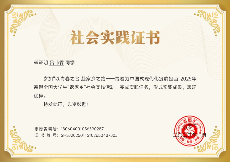 在大学生“返家乡”社会实践志愿服务活动的项目推荐中,吕沛霖选择河北省保定市莲池区人民法院进行志愿服务,以家乡法院作为实践平台,用自己的热情为家乡法治建设贡献青春力量。他参与了法律文书送达、案件卷宗整理归档、电子卷宗录入等工作,并协助开展法律咨询服务,为来访群众提供诉讼流程指引,用严谨的态度展现了新时代大学生的责任感。吕沛霖认为,返乡实践不仅是一个学习和提升的过程,更是一份情感的连接与归属。“法律的力量在于公平与正义,宛如一座巍峨的灯塔,庄重而神圣。通过实践活动,我身临其境感受到法律威严,体会到法治精神在国家治理中的重要作用。”他说。