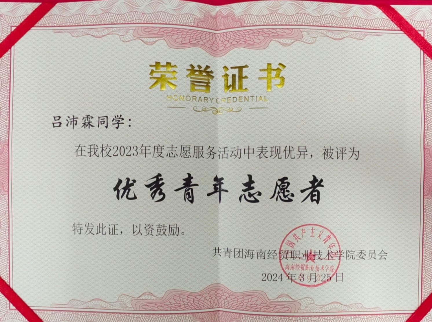 除此之外,吕沛霖还积极参加暑期“三下乡”社会实践活动,在第27届中国(海南)国际热带农产品冬季交易会上开展专业调研,跟随团队实地考察调研学校大学生创新创业示范基地——广地龙养殖与研发中心等。在实践活动中的杰出表现,他荣获了2023年学校“优秀青年志愿者”荣誉称号。