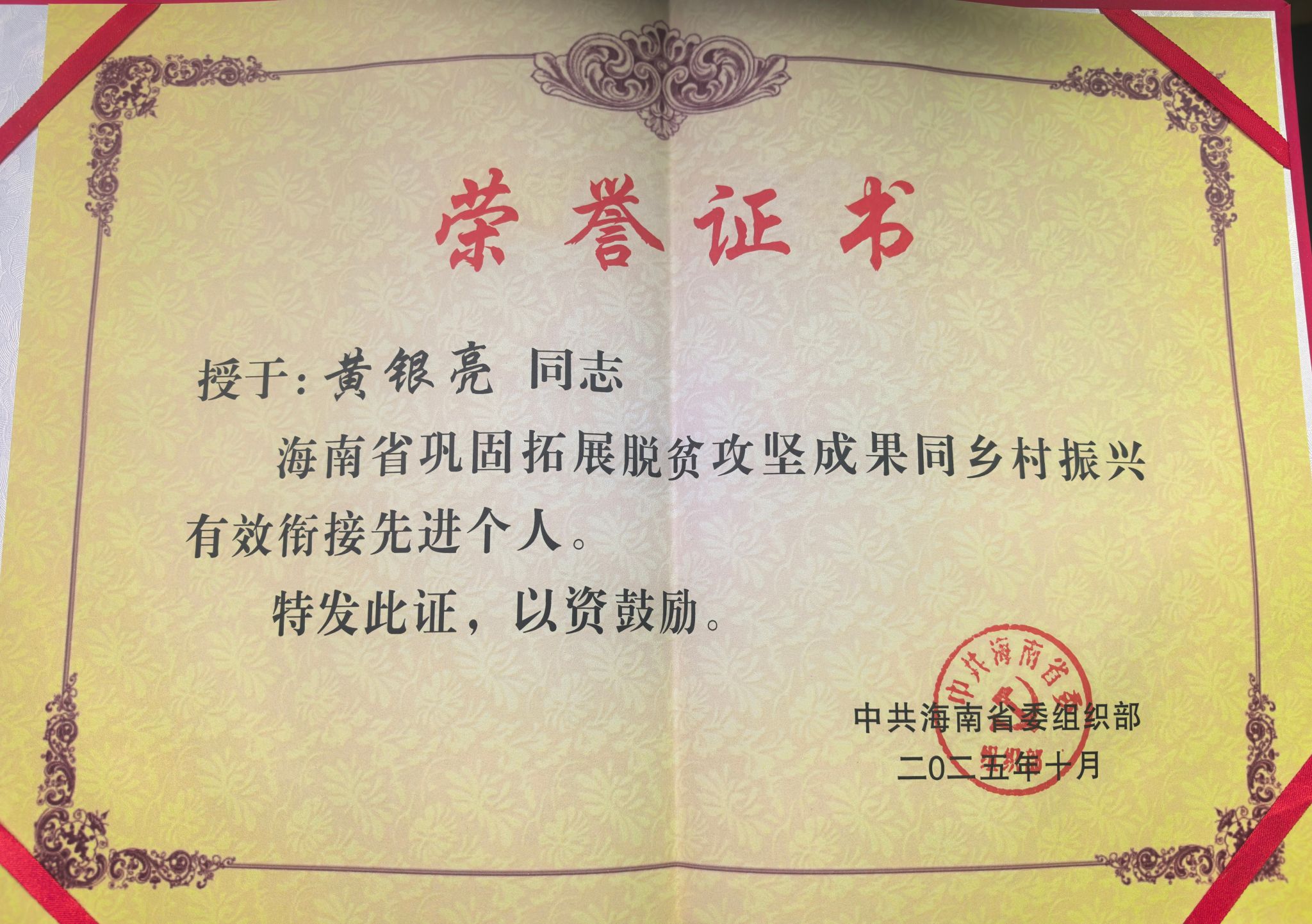 近日,kaiyun登录中国入口登录教师黄银亮同志荣获"海南省巩固拓展脱贫攻坚成果同乡村振兴有效衔接先进个人"称号。2023年7月至2025年8月,黄银亮以红旗镇镇委副书记(兼),红旗村驻村第一书记、乡村振兴工作队队长的身份,扎根乡土、躬身力行,在琼州的田野乡间谱写了一篇篇饱满而精彩的振兴故事。