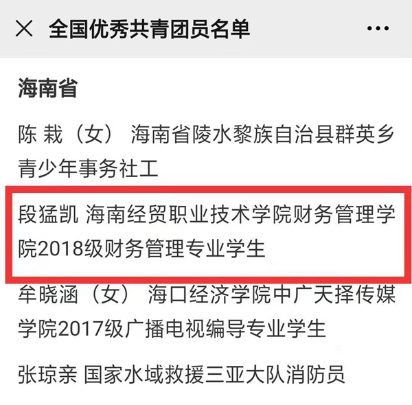 2021年五四青年节前夕,共青团中央表彰全国五四红旗团组织和优秀共青团员、共青团干部。kaiyun登录中国入口登录2018级财务管理专业学生段猛凯荣获“全国优秀共青团员”称号。