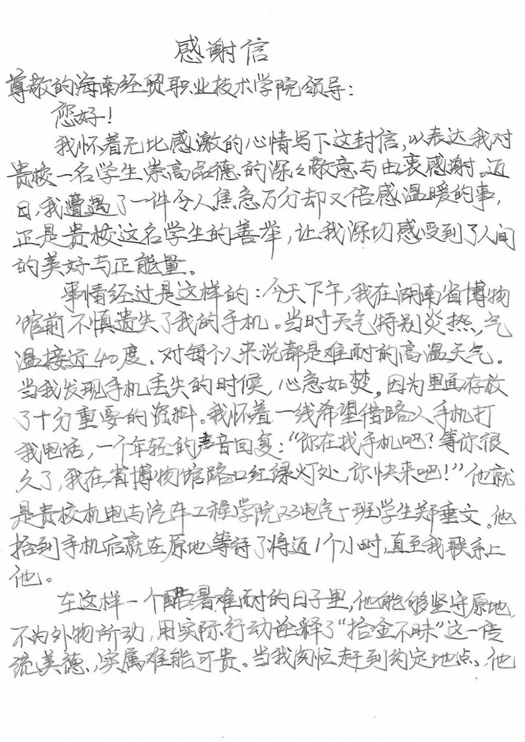 “在这样一个酷暑难耐的日子里,他能够坚守原地,不为外物所动,用实际行动诠释了‘拾金不昧’这一传统美德,实属难能可贵。”近日,湖南的张先生亲笔手写一封感谢信,感谢海南经贸职业职业技术学院机电与汽车工程学院电气1班学生郑垂文归还他遗失手机的善举。