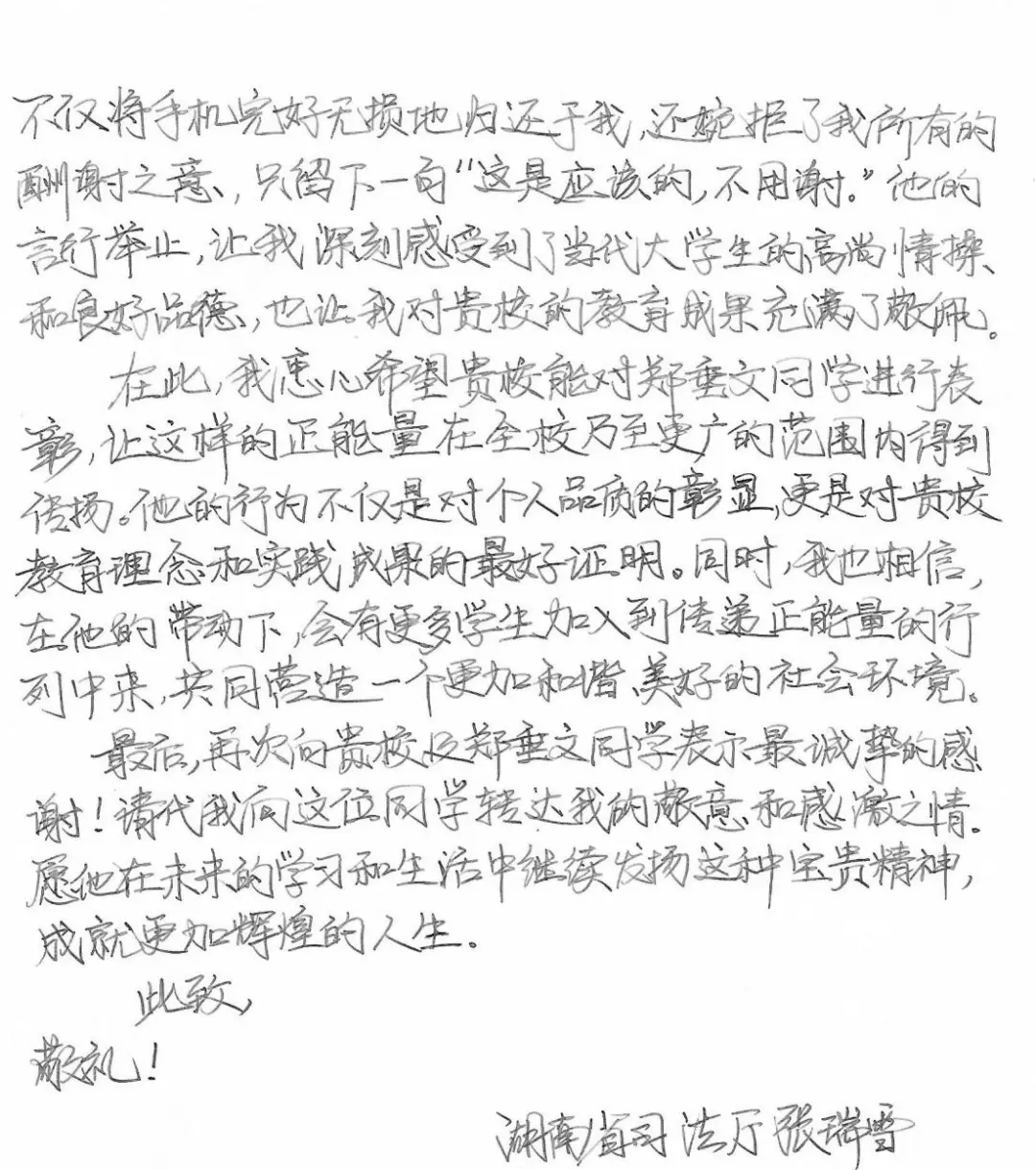 张先生在感谢信中说:“郑同学不仅将手机完好无损地归还于我,还婉拒了我所有的酬谢之意。他的言行举止,让我深刻感受到了当代大学生的高尚情操和良好品德。他的行为不仅是对个人品质的彰显,更是对贵校教育理念和实践成果的最好证明,也让我对贵校的教育成果充满了敬佩。我希望让正能量在贵校乃至更广的范围内得到传扬。”