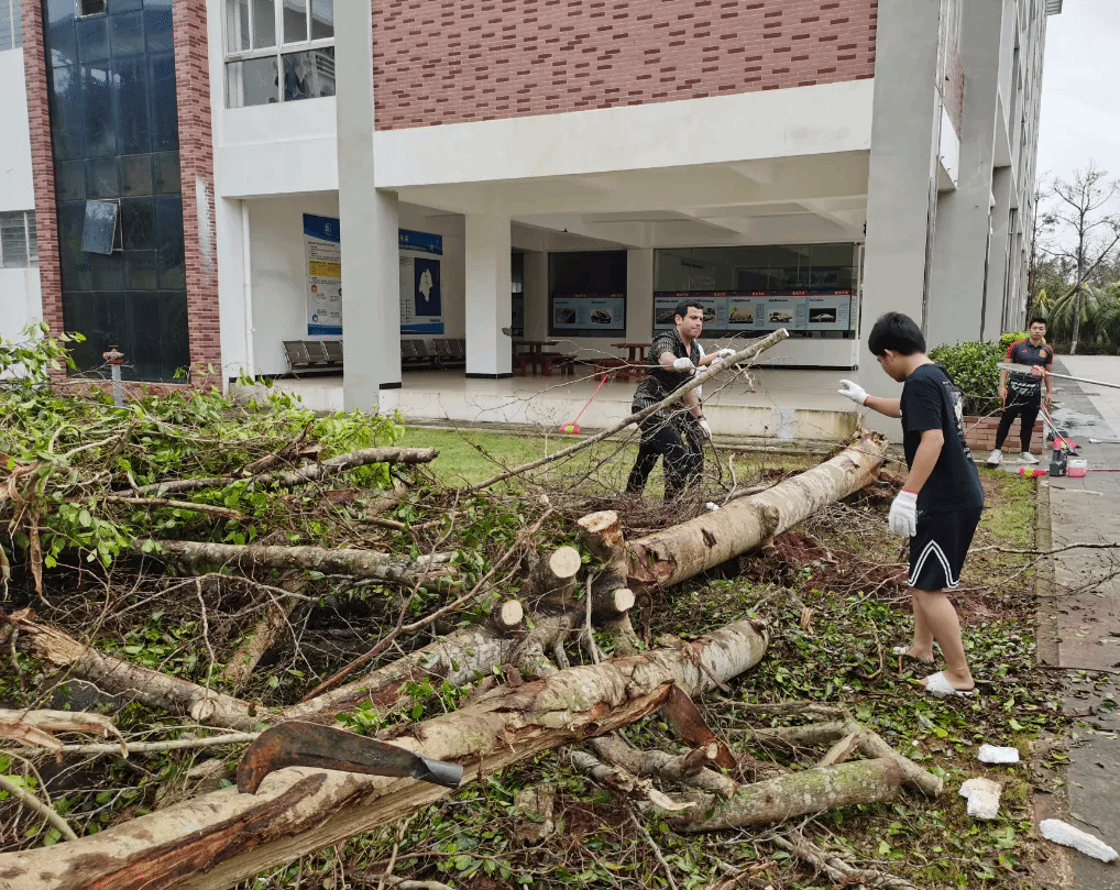9月11日一大早,外尔就积极返校参与校园清障、垃圾清运、道路打扫等工作,与国际旅游学院师生默契配合,奋力挥动着扫帚、竹耙等工具,将堆积在校园道路两侧的树枝整理清扫,用自己的双手将树干搬运到清运车上。雨水与汗水交织在一起,浸湿了衣衫,却丝毫没有影响他的热情和投入。