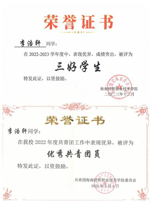 课堂上,他是专注的聆听者;课后,他是知识丛林的探险家。在校期间,李浩轩一直把学习放在首位,积极投入到各门基础课和专业课的学习中,在2022-2023学年专业成绩和学生综合素质测评中均排名第一。他积极参加芬兰线上国际交流合作培训班、Shopee跨境电商基础运营技能等专业相关培训,不断拓展知识。在做好专业学习的同时,他积极参加各类竞赛,获得国家级OCALE跨境电商创新创业大赛三等奖、全国首届大学生职业规划大赛省赛三等奖、“中国教育电视台•外研社杯”职场英语挑战赛(写作赛项)海南赛区一等奖、校级电子商务“三创赛”两项二等奖。“通过参加竞赛,我学习了理论知识,增强了专业技能,也为我的职业发展奠定了良好的基础。”李浩轩说。