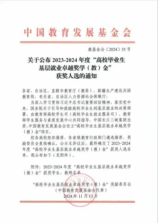 “高校毕业生基层就业卓越奖学(教)金”由教育部高校学生司(高校毕业生就业服务司)、教育部学生服务与素质发展中心共同指导,中国长江三峡集团有限公司出资,中国教育发展基金会设立。该奖项旨在贯彻落实党中央、国务院关于引导和鼓励高校毕业生到基层就业的决策部署,奖励赴基层就业创业并作出突出业绩的普通高校毕业生,以及普通高校指导服务大学生赴基层就业工作有突出贡献的教师。2023-2024年度,全国共有398名优秀高校毕业生和60名优秀指导教师获得奖励,其中135所高职院校获奖,15名职校教师获奖,121名职校学生获奖。