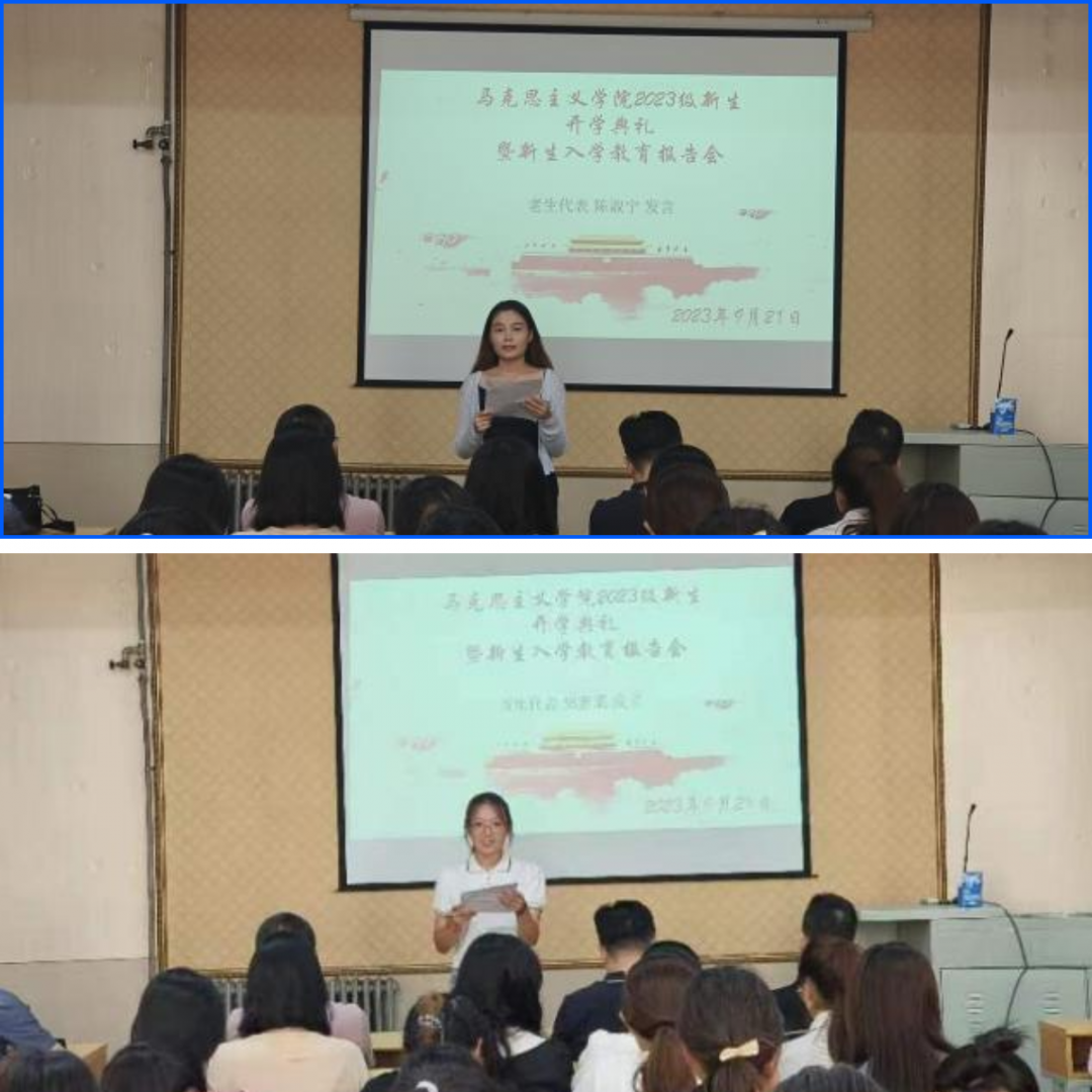 2022级研究生陈淑宁作为老生代表上台讲话。陈淑宁学姐与新生们分享了她的大学学习和生活的经验,鼓励新生们充分利用美好的大学时光充实、完善自己。希望新生们也以优秀的学长学姐为榜样,不断进取、拼搏向上。随后新生代表柴萱羽进行发言,代表新2023级本科生表达了对未来在马院求学生活的憧憬及目标。