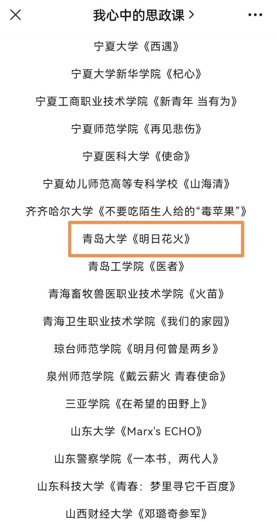 为深入贯彻习近平总书记关于“大思政课”建设的重要指示批示精神,充分发挥高校思政课立德树人关键课程作用,由教育部高校思想政治理论课教学指导委员会主办、武汉大学必赢242net官网承办的第六届“我心中的思政课”全国高校大学生微电影展示活动顺利落下帷幕。青大思政大课堂积极参与此次活动,推送优秀作品25件,经过层层遴选,我校学生作品《明日花火》荣获本次比赛的优秀奖。