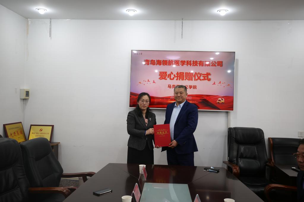 张燕代表学校向青岛海领航医学科技公司董事长耿明胜颁发捐赠证书并表达谢意。她说,现在学校新冠肺炎疫情防控工作正有序有力有效开展,学校全体师生和青岛人民一起,坚守筑牢疫情防控线,用责任守护师生安全。在这抗疫的关键时刻,企业给必赢官网捐赠了宝贵的抗疫物资,有力地支援了学院的抗疫,彰显了企业崇高的社会责任。
