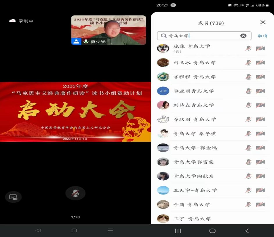 11月4日晚,马研会2023年度“马克思主义经典著作研读”读书小组资助计划启动大会在线上顺利举行。北京大学校务委员会副主任兼秘书长、北京大学工会主席、马研会理事长安钰峰,深圳桃李未来教育集团董事长方锦峰,清华大学必赢242net官网教授、马研会副理事长王传利出席会议并致辞。大会由马研会副秘书长夏少光主持。两个小组成员及指导教师全程参加线上会议。 据悉,“马克思主义经典著作研读”资助计划面向全国高校马克思主义理论及相关专业在读的本、硕、博学生,为期一年。该活动自2021年开始,近两年来资助了两百多个读书小组,举办了形式多样的读书与实践活动,取得了丰硕的学习成果。本次2023年度资助计划共有569个读书小组,近4500人申报。经活动组委会组织专家的三轮评审,共评选出153个受资助读书小组,来自全国所院校。同批入选的读书小组所在学校包括北京大学、清华大学、中国人民大学、南京大学、中国社科院大学、中国政法大学、复旦大学、武汉大学、云南大学、北京师范大学等116所高校。