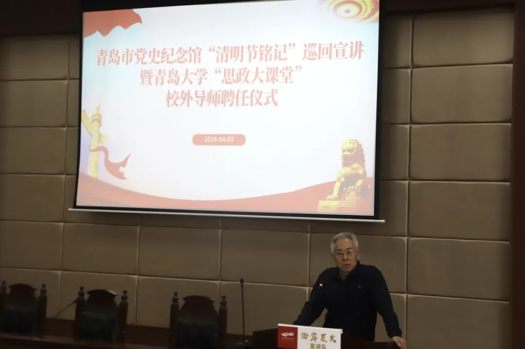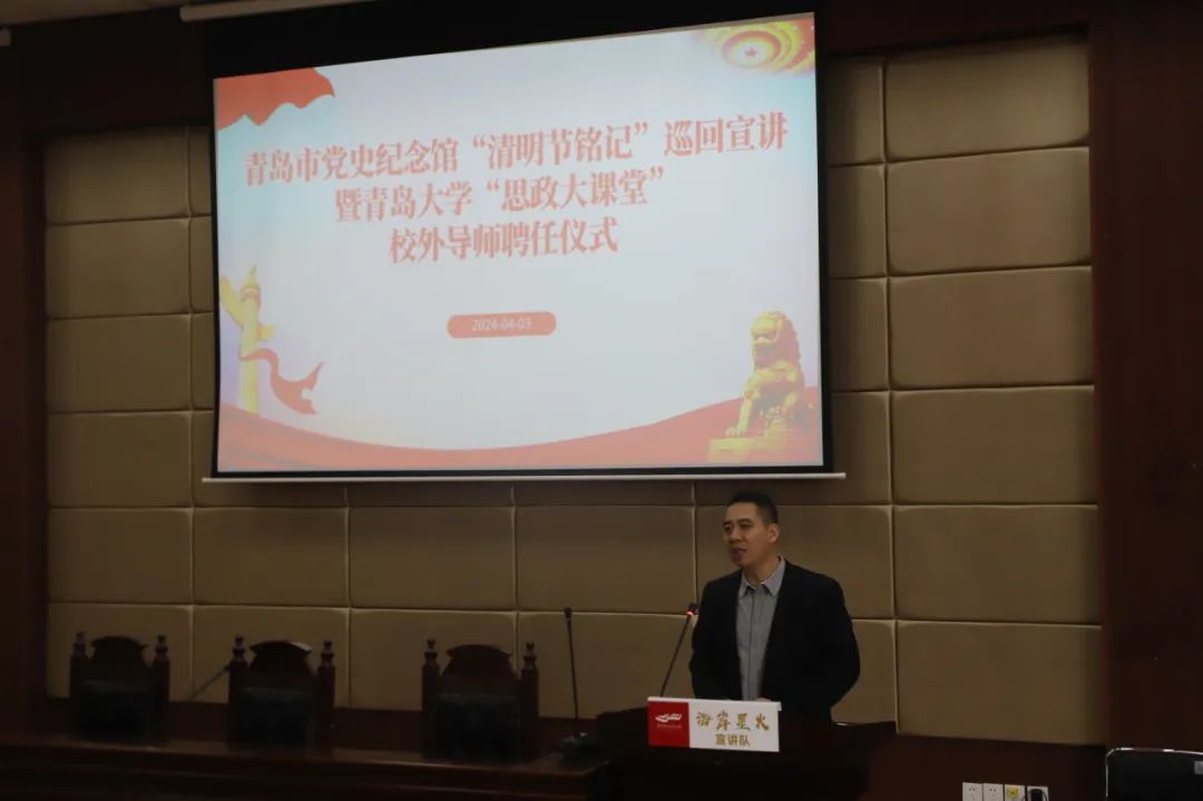 为深入贯彻习近平总书记关于用好红色资源、传承红色基因、推动理想信念教育常态化制度化的重要指示,必赢242net官网联合中共青岛党史纪念馆于4月3日隆重举办了“清明节铭记”巡回宣讲暨“思政大课堂”校外导师聘任仪式。党史纪念馆馆长宋红、必赢242net官网党委书记王传永、副院长姜文明、“思政大课堂”中心主任刘正刚、教研部主任李丙清等领导嘉宾出席,中共青岛党史纪念馆“海岸星火”宣讲队成员及必赢242net官网、师范学院学前教育专业学生共同参与。本次活动由必赢242net官网副院长姜文明主持。