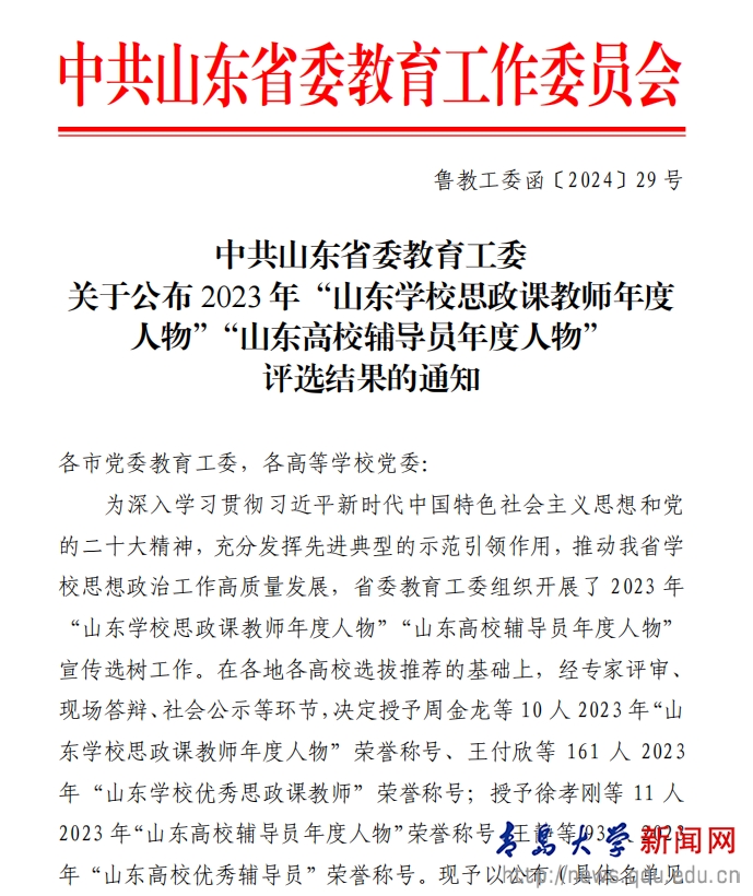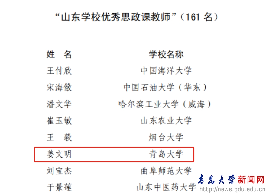 近日,中共山东省委教育工委公布了2023年度“山东学校思政课教师年度人物”评选结果,必赢官网教师姜文明荣获“山东学校优秀思政课教师”称号。
